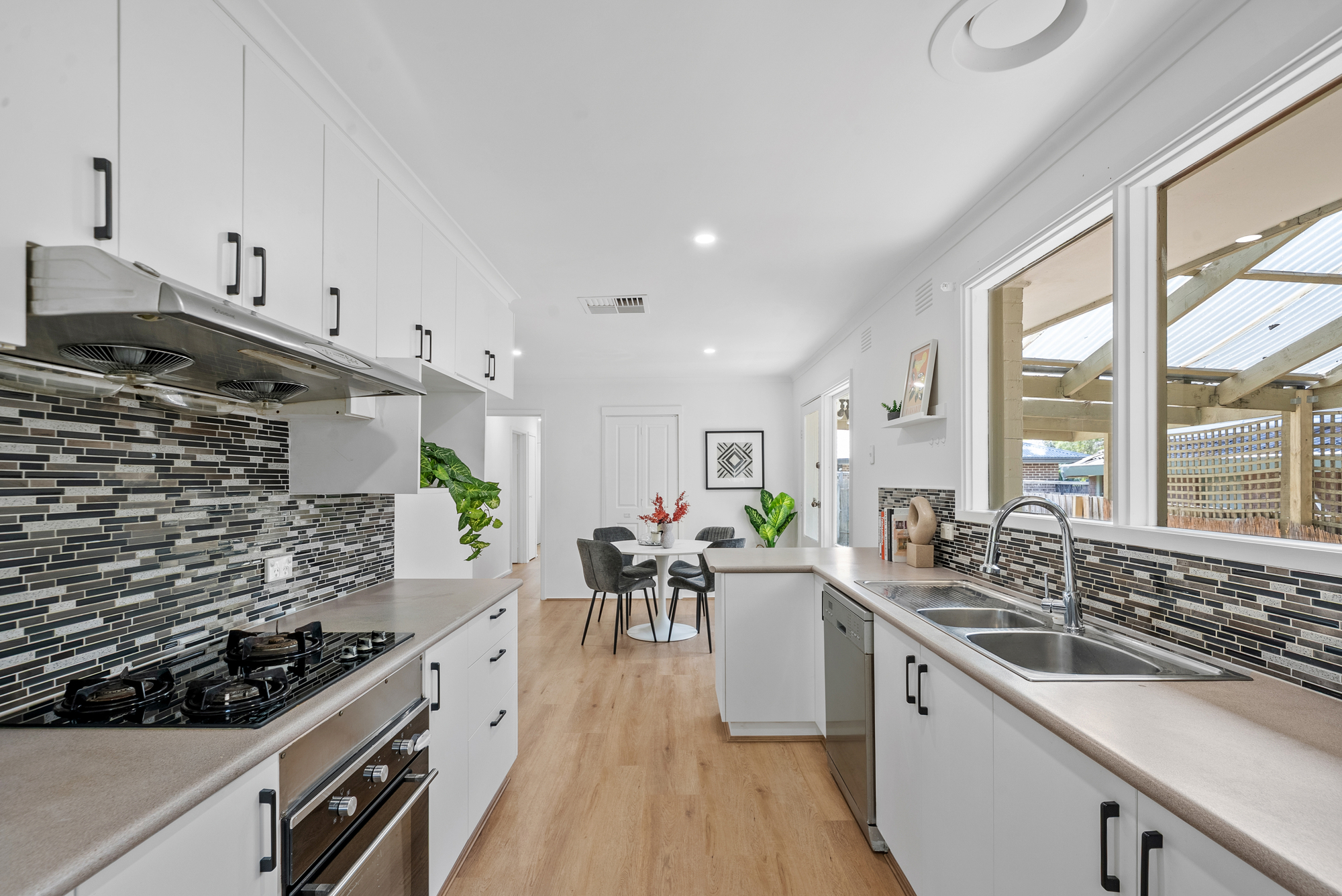 The kitchen is spacious and practical, featuring a gas cooktop, Bellini electric oven, dishwasher and tiled splashback. Ample cabinetry and bench space make everyday cooking easy, while its open connection to the dining area enhances functionality for family life and entertaining.