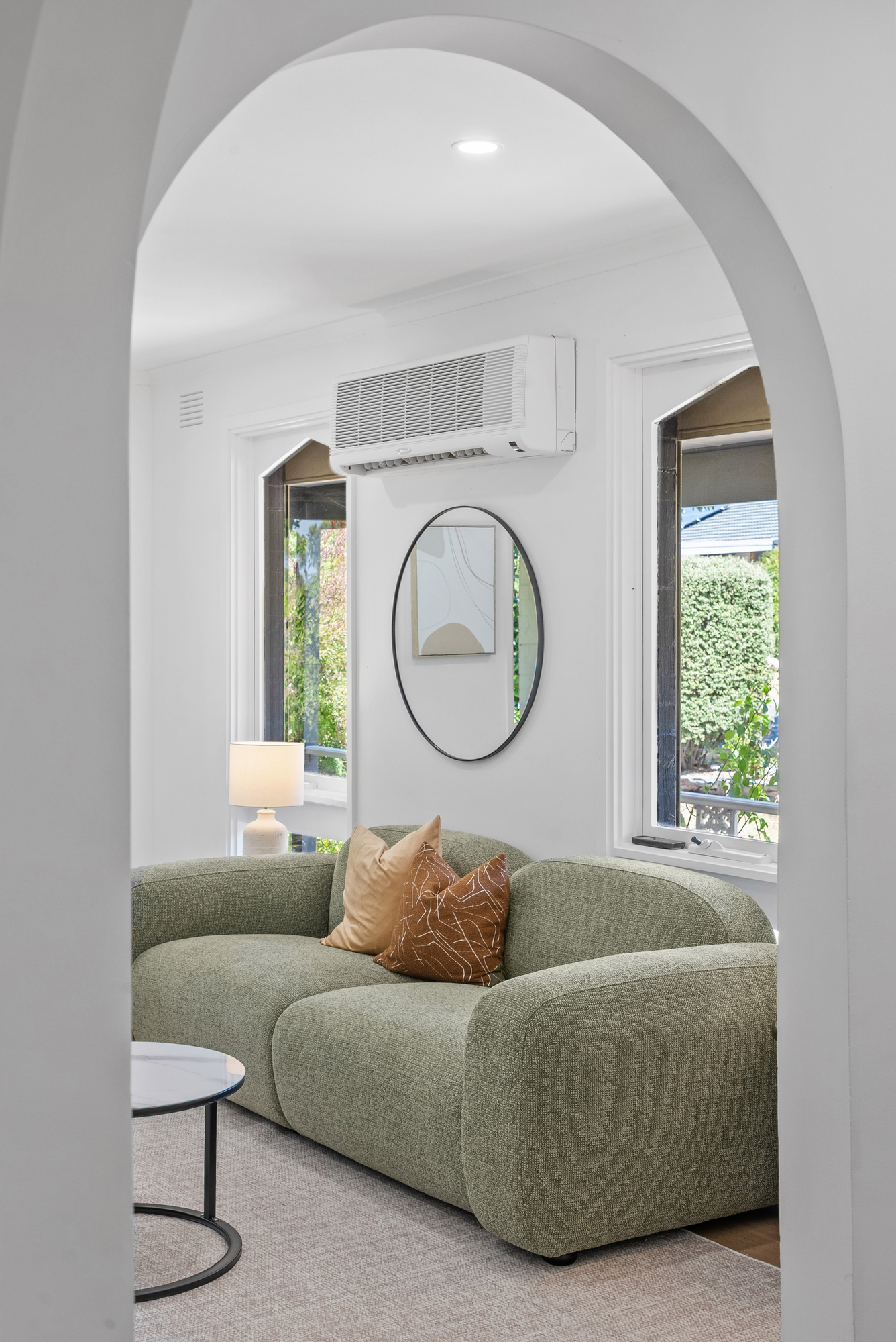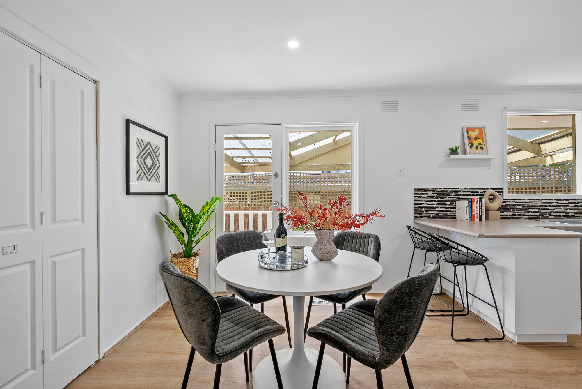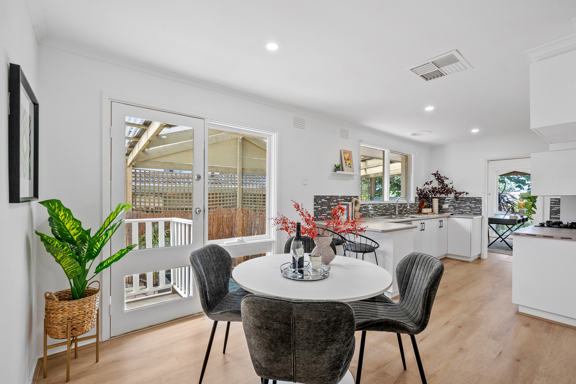 At the heart of the home is a light filled open living and dining zone that flows seamlessly into the kitchen. Timber flooring and LED downlights create a warm, modern feel, while ducted heating and evaporative cooling ensure year round comfort. A split system unit in the living area provides additional climate control.