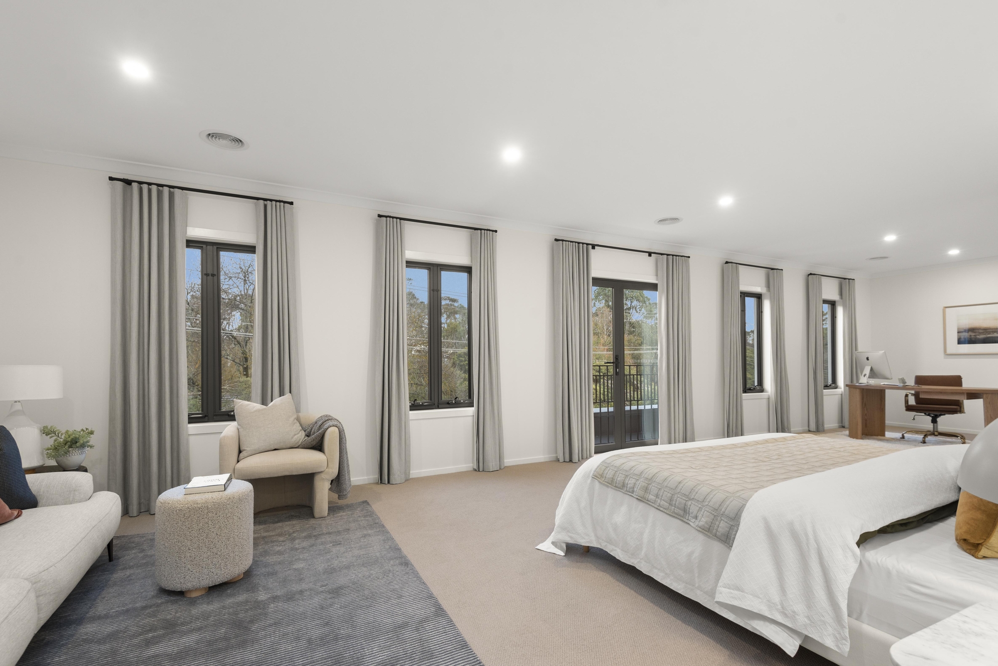 Accommodation includes a choice of two master bedrooms, including a ground-floor guest suite, and the palatial main bedroom that feels more like a sanctuary, with space to relax, work, or unwind, featuring a study nook, sitting area, a huge walk-in robe, and a deluxe ensuite that caters to daily living and indulgence. A teenager’s retreat, three additional robes bedrooms (two with modern ensuites), and a stylish family bathroom complete the upstairs layout.