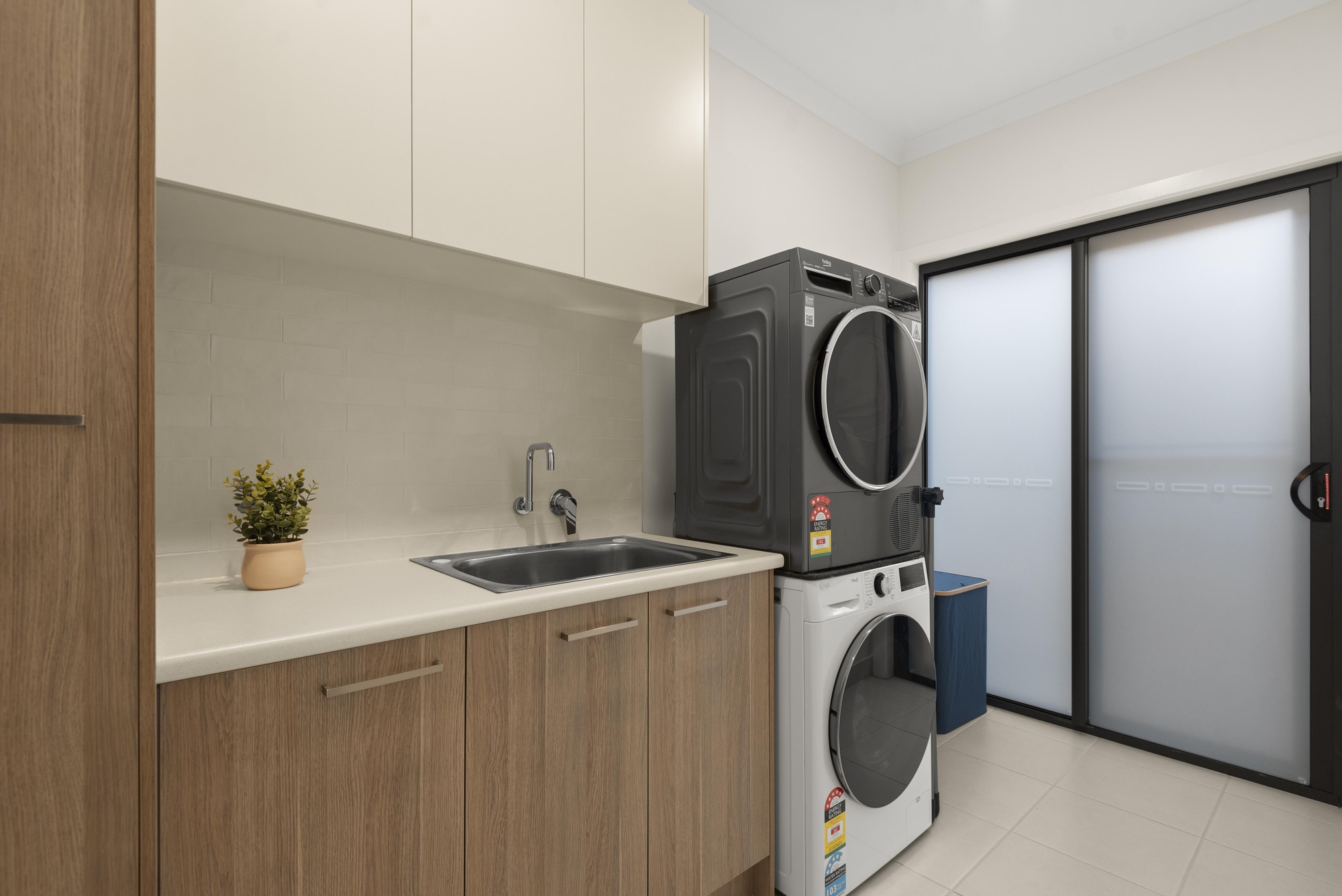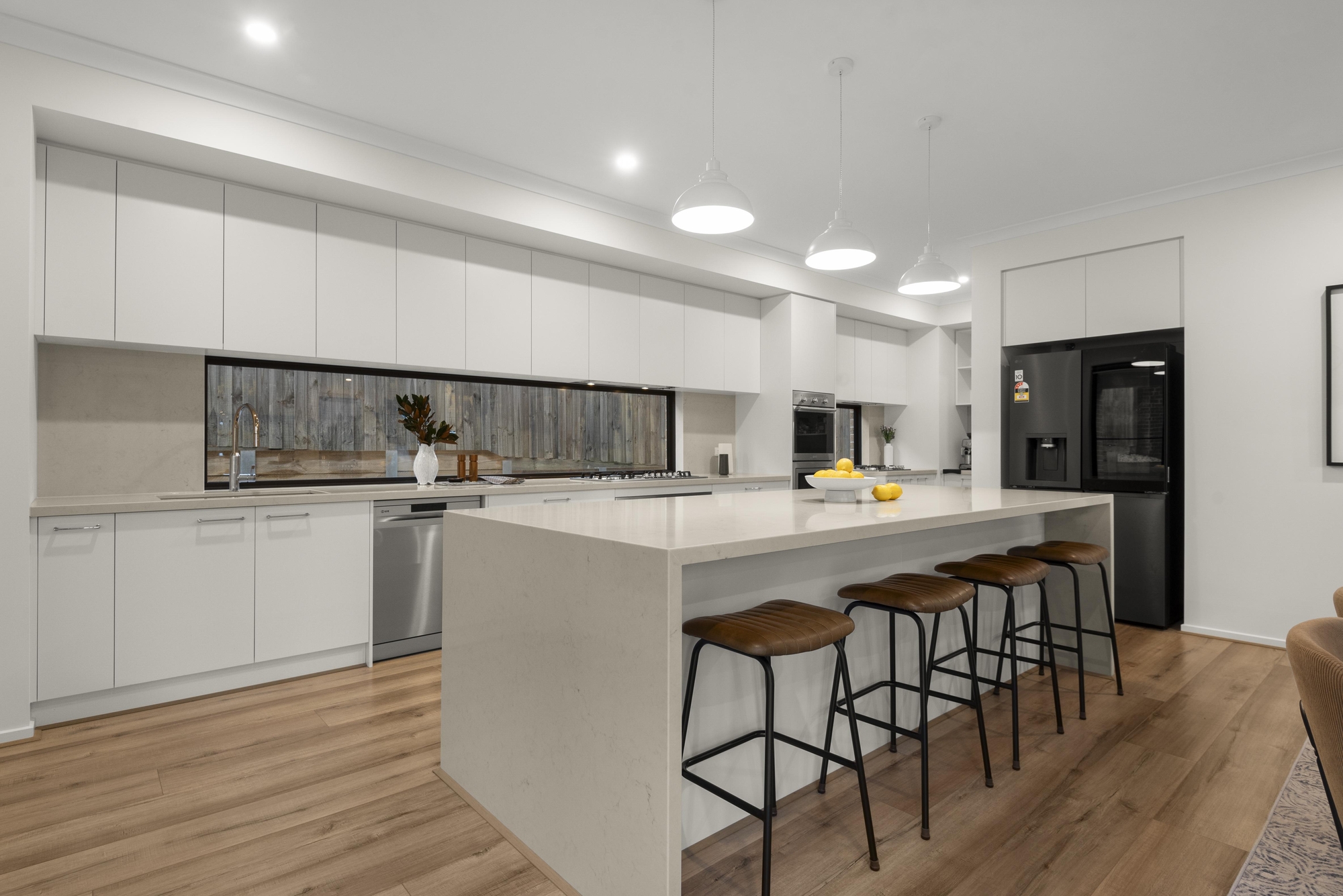 Answering the needs of modern life, the generous family and dining zone bask in northern light and frame inviting poolside views, accompanied by a state-of-the-art kitchen that caters to every occasion. Boasting stone benchtops, premium Ilve appliances (including dual ovens and an integrated microwave), a walk-in pantry, and a butler’s pantry, it’s a space designed for effortless entertaining.