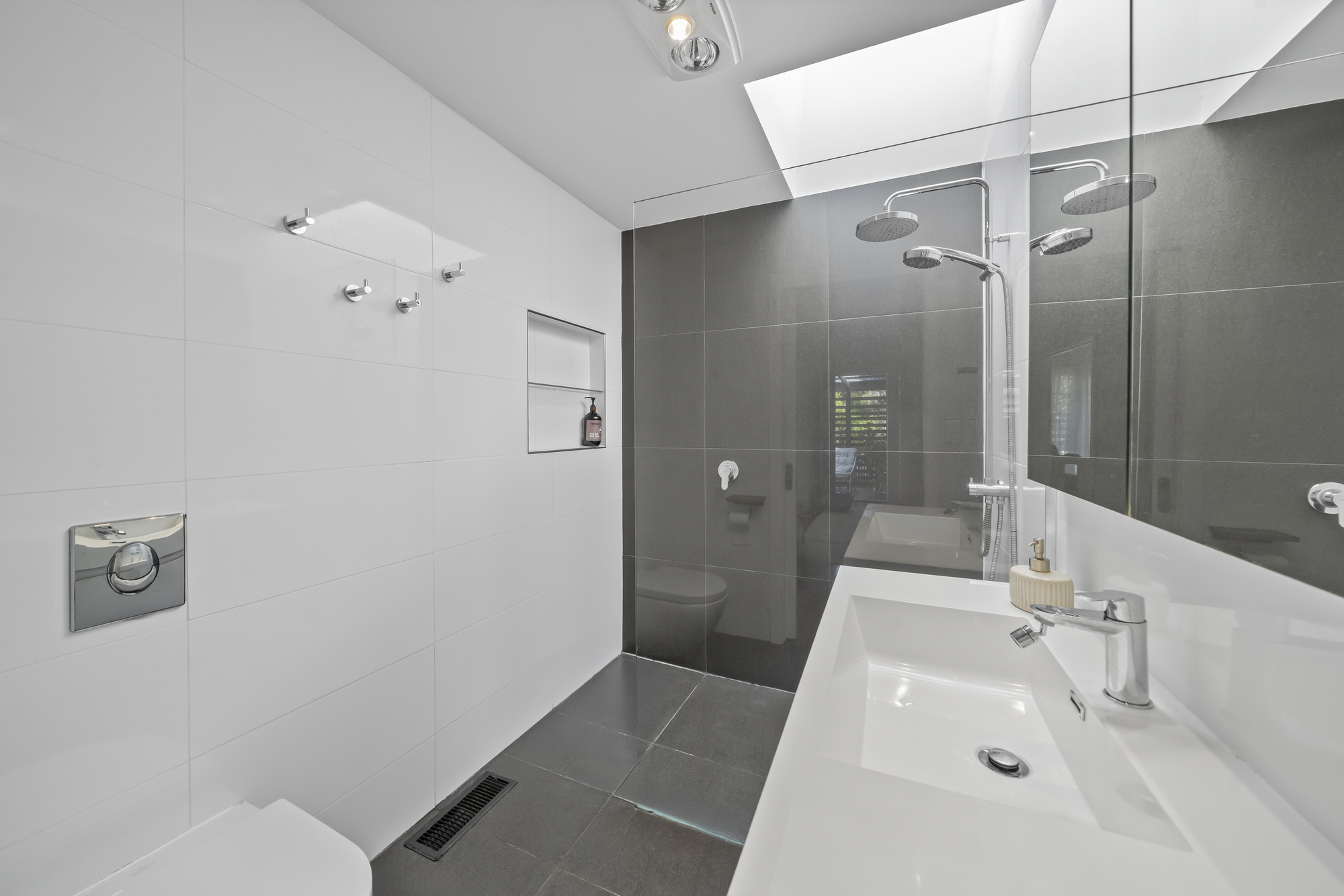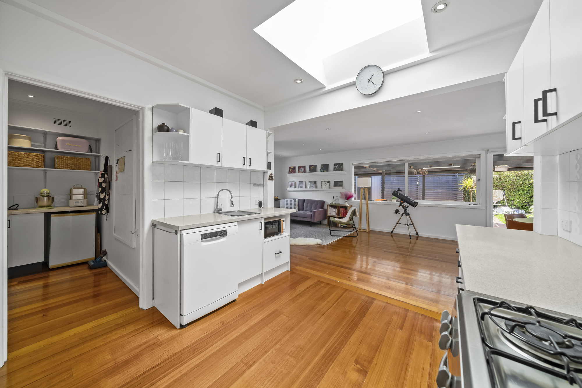 The rear of the home opens into a welcoming open-plan family and dining zone, creating a natural hub for everyday living. The kitchen overlooks this space and features a freestanding cooker, sunny skylight, and spacious butler’s pantry. Indoor–outdoor flow is enhanced by direct access to both covered and uncovered timber decks, providing versatile entertaining zones throughout the year.