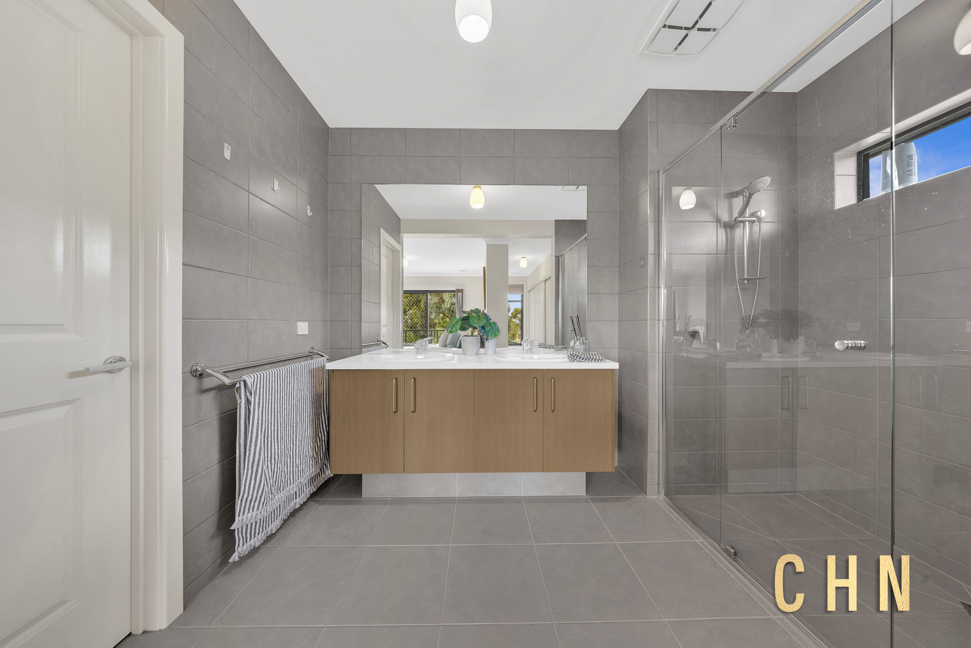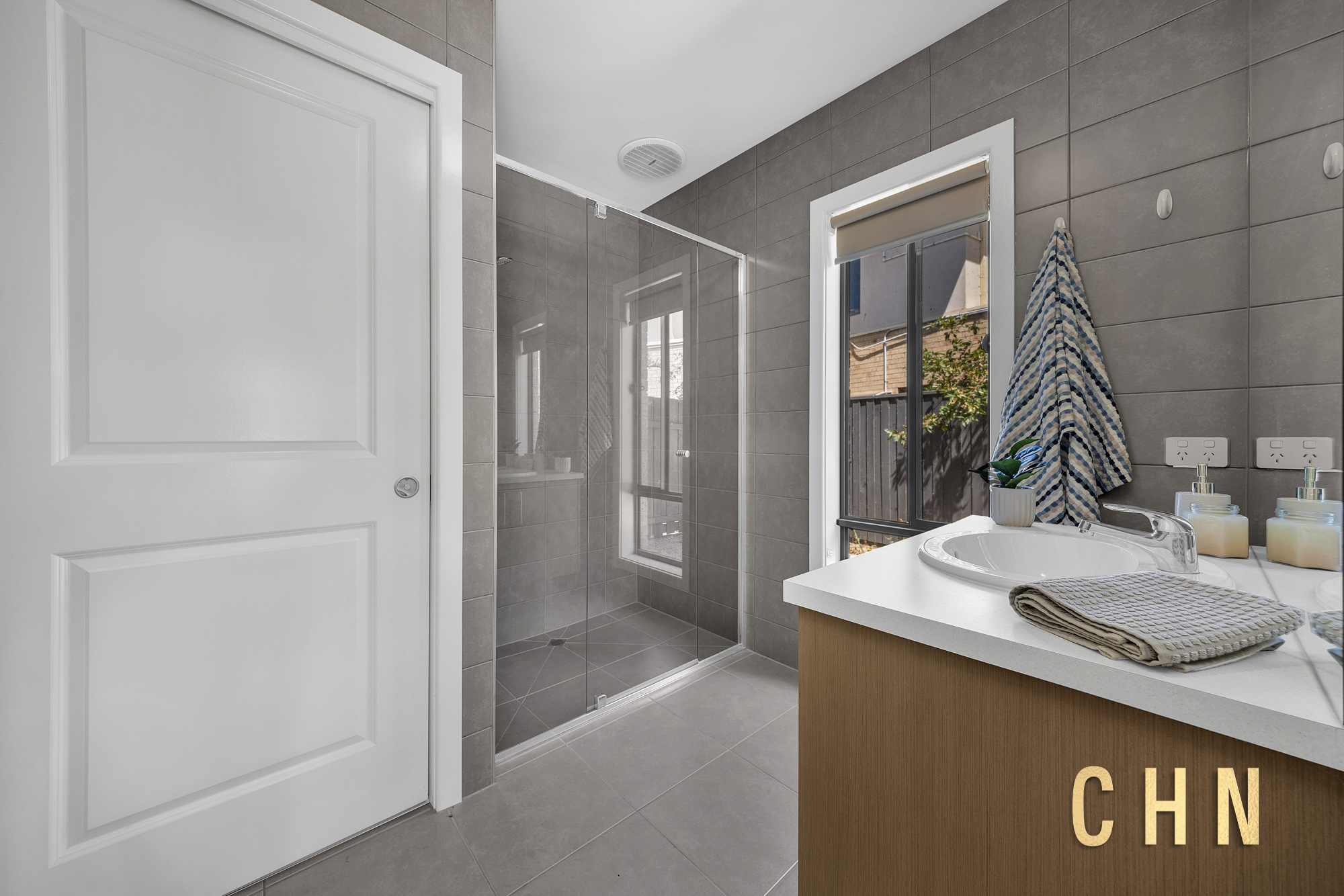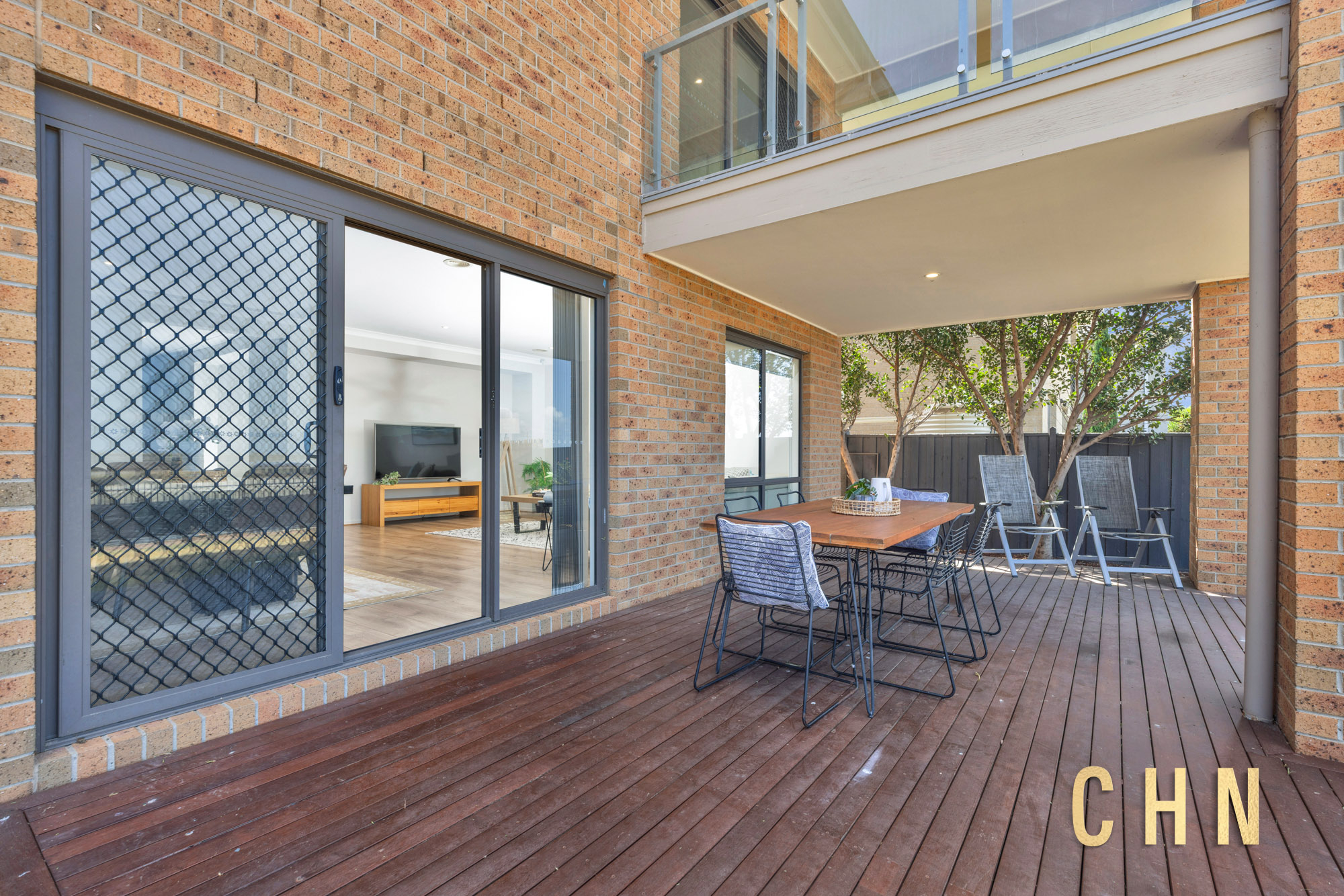 A ground-floor bedroom with private ensuite provides excellent flexibility for guests or extended family, finished with floor-to-ceiling tiling in a contemporary concrete style. Sliding doors extend the living area to a timber-decked alfresco, where the elevated setting captures sweeping outlooks across the surrounds and through to Port Phillip Bay, offering an impressive backdrop for outdoor entertaining.