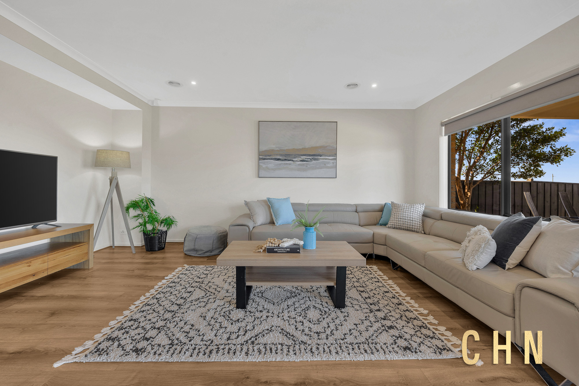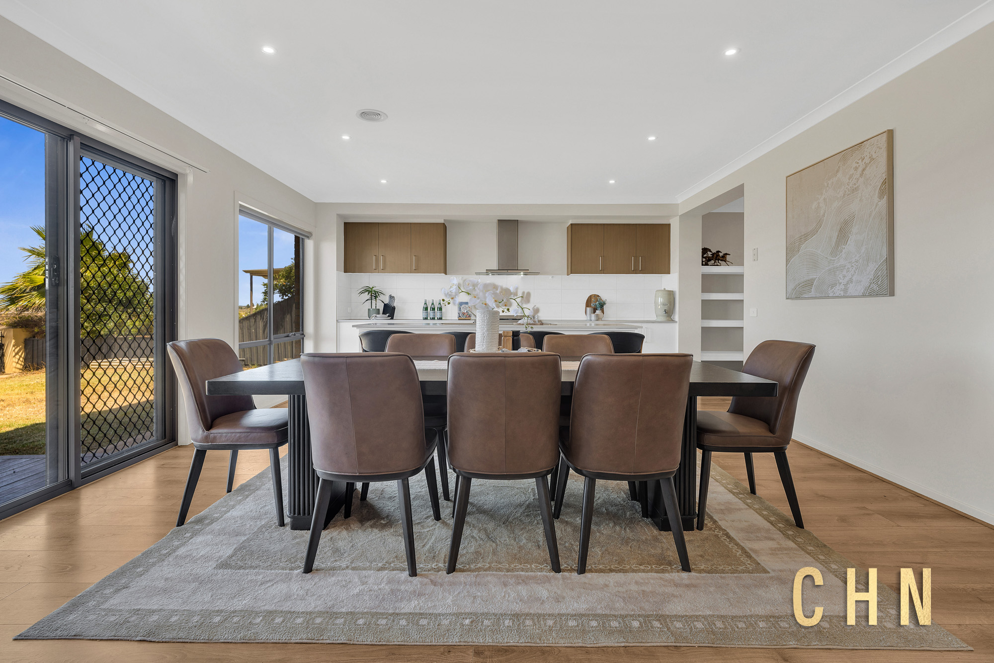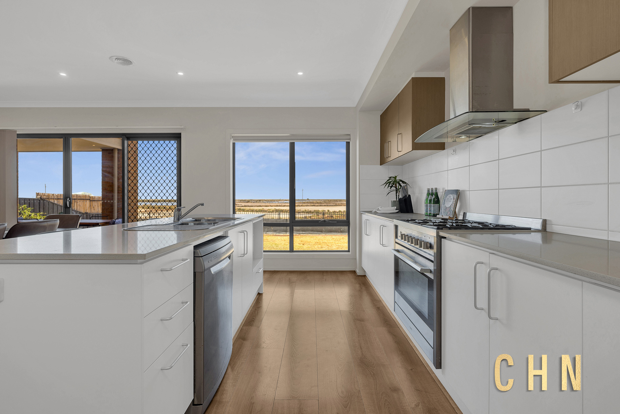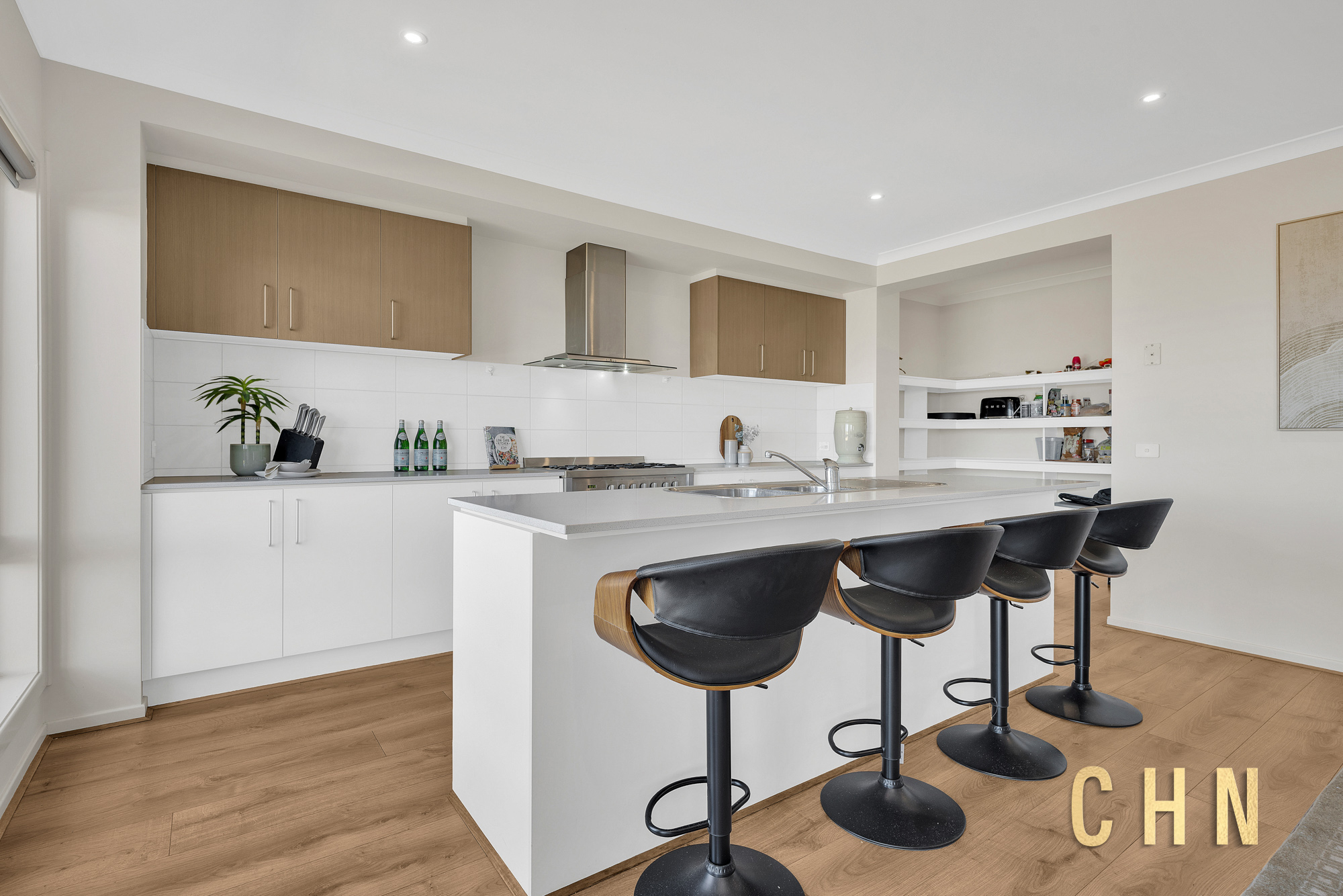 The west-facing home opens to timber flooring, downlighting and a spacious open-plan family and dining area, designed to maximise light and outlook. At the centre of the home, the island kitchen features a stone Leland benchtop with breakfast bar seating, 900mm cooktop and oven, tiled splashback and a walk-in pantry, creating a practical yet stylish hub for everyday living and entertaining.
