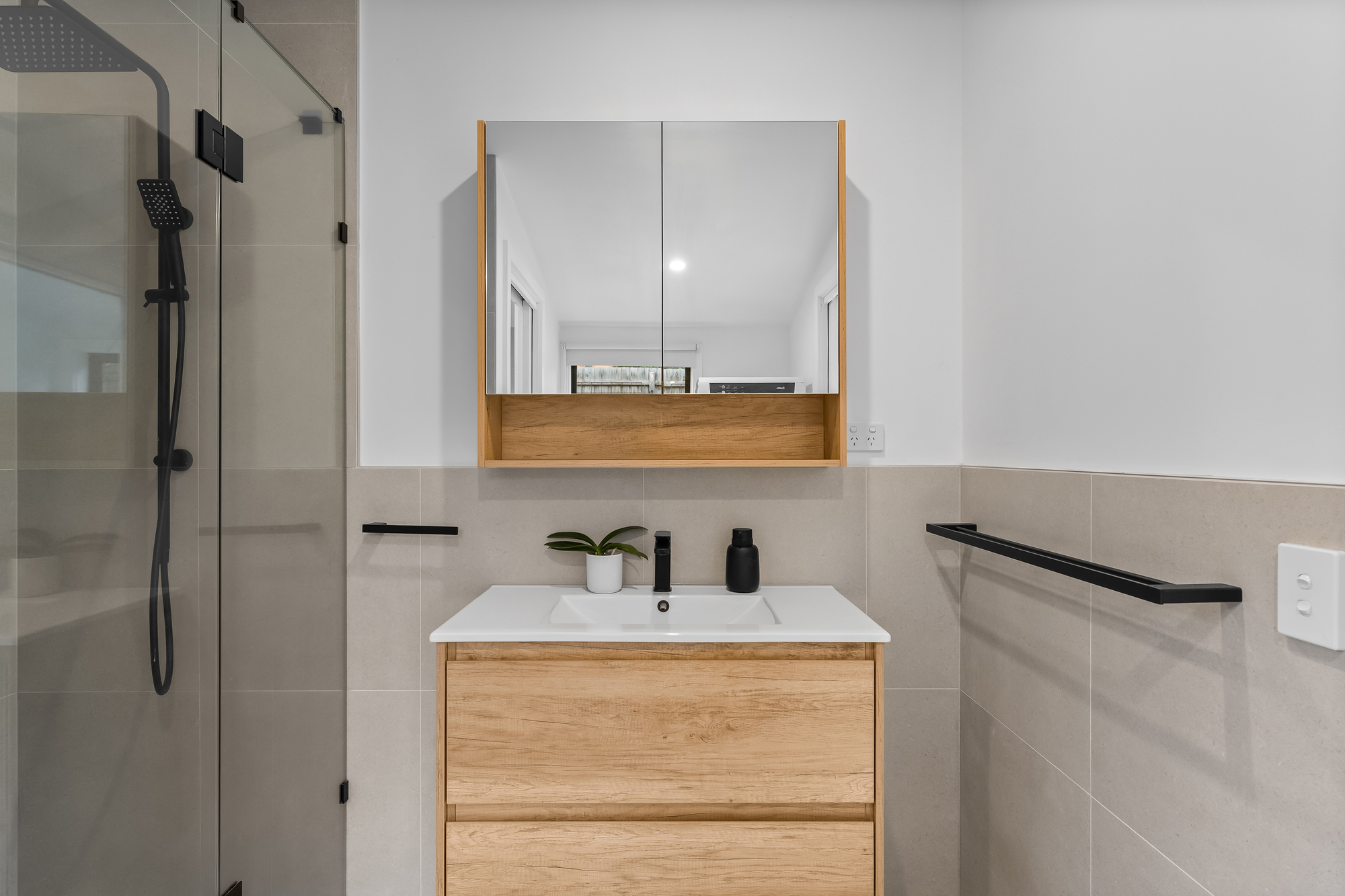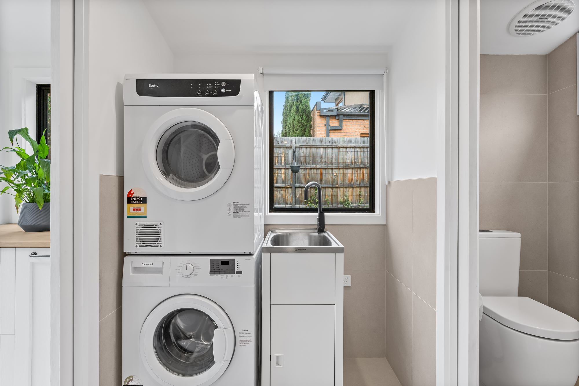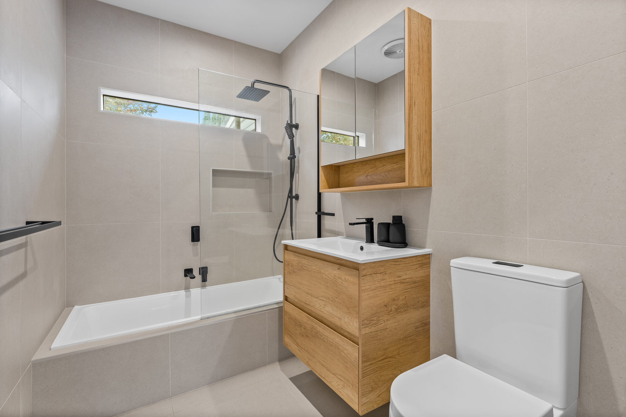 Both bathrooms are fully tiled and finished to a modern standard. The main bathroom includes a combined bathtub and dual-head rainfall shower, porcelain vanity benchtop, and mirrored storage. The second bathroom is combined with the laundry and features a dual-head rainfall shower and a separate toilet, adding excellent everyday practicality.