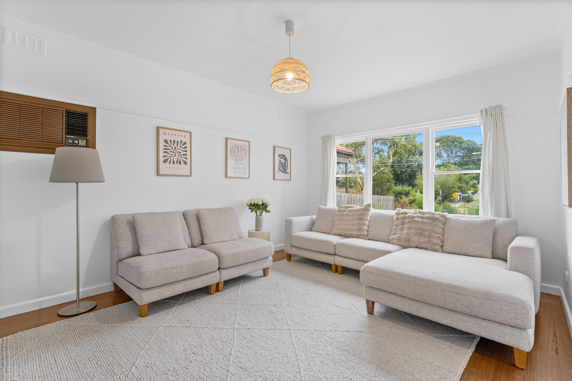 The home showcases a welcoming layout with separate living and dining zones, both enhanced by timber flooring, high ceilings, and abundant natural light. The living room enjoys pleasant outlooks over the front yard and is equipped with split-system air conditioning, while gas ducted heating via floor vents ensures year-round comfort throughout the home.