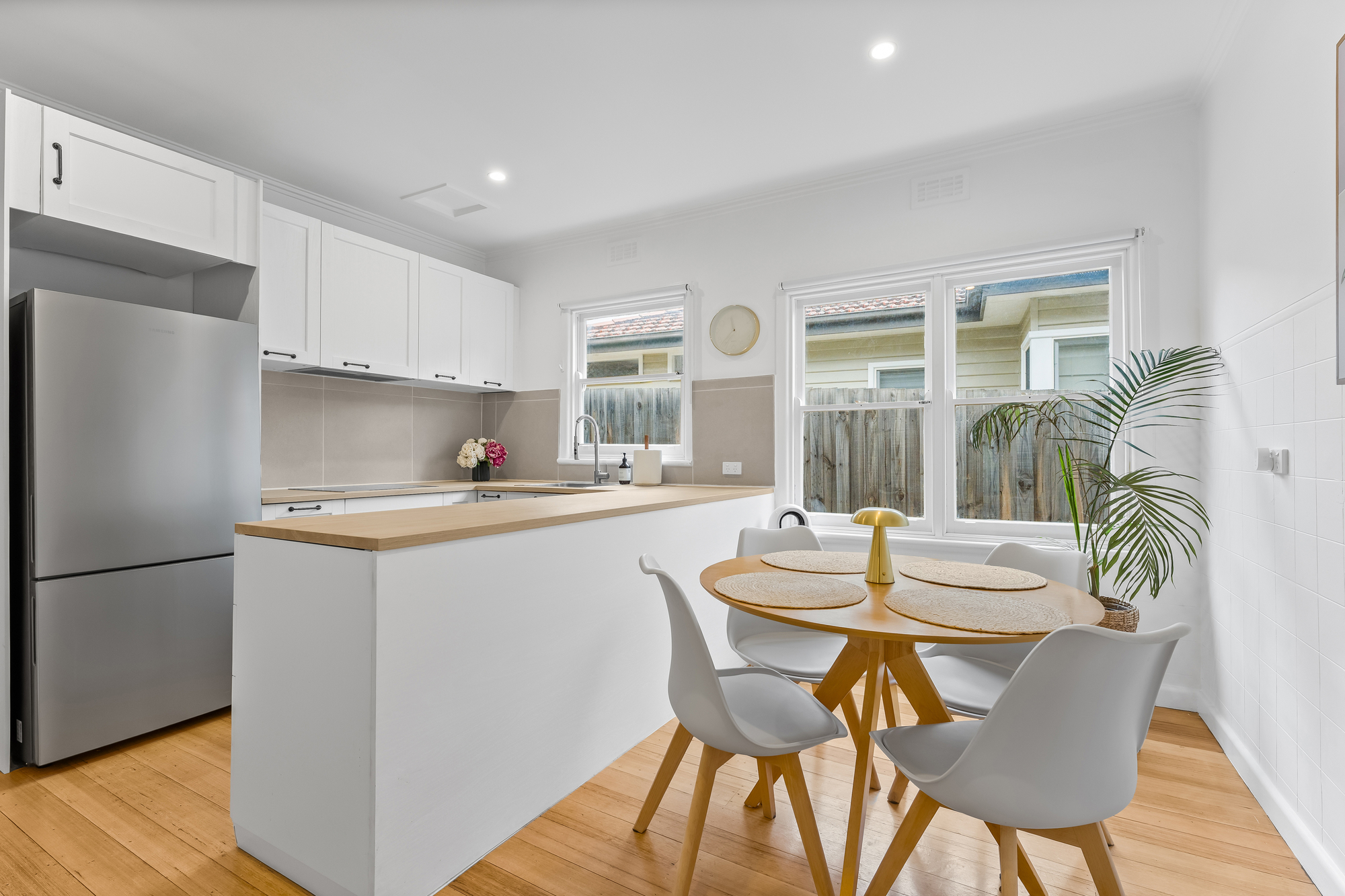 The kitchen flows seamlessly into the dining area and features timber flooring, a timber benchtop, and crisp white cabinetry. Well appointed for everyday family use, it includes a large single sink and quality appliances such as an induction cooktop, electric oven, and hidden dishwasher.