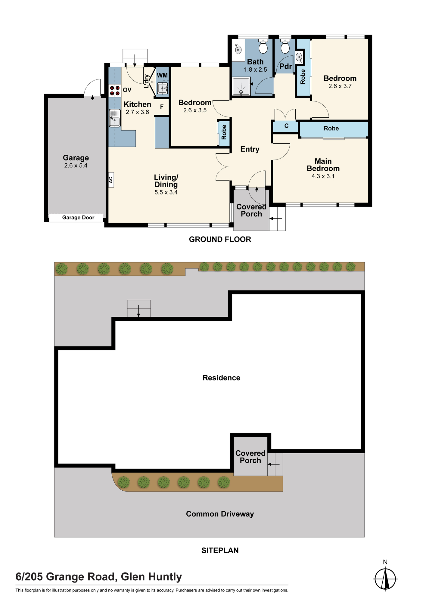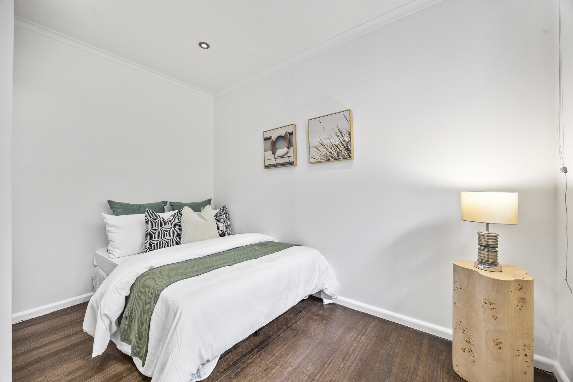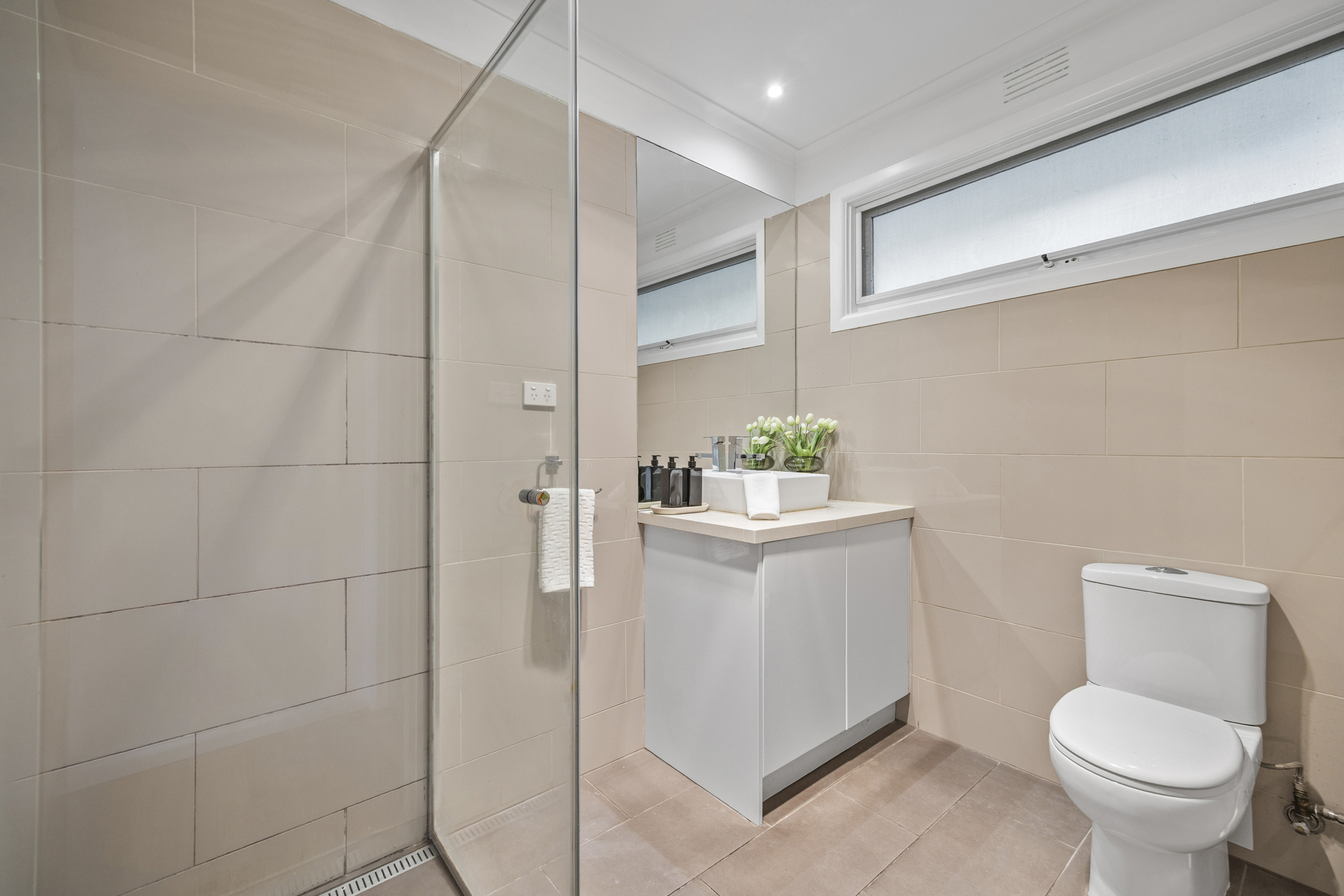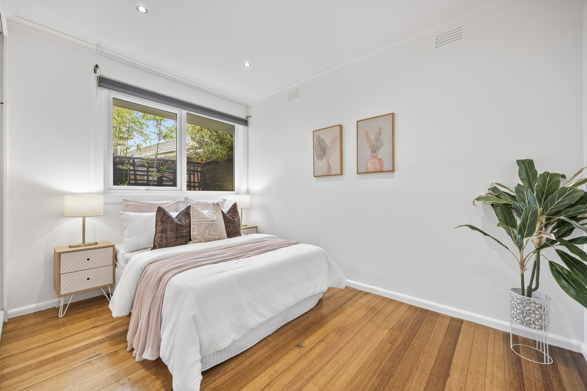 Accommodation comprises three well-proportioned bedrooms, all fitted with built-in robes and hardwood flooring. The central bathroom is finished with floor-to-ceiling tiling, a frameless shower, and single vanity, complemented by a separate WC for added convenience.