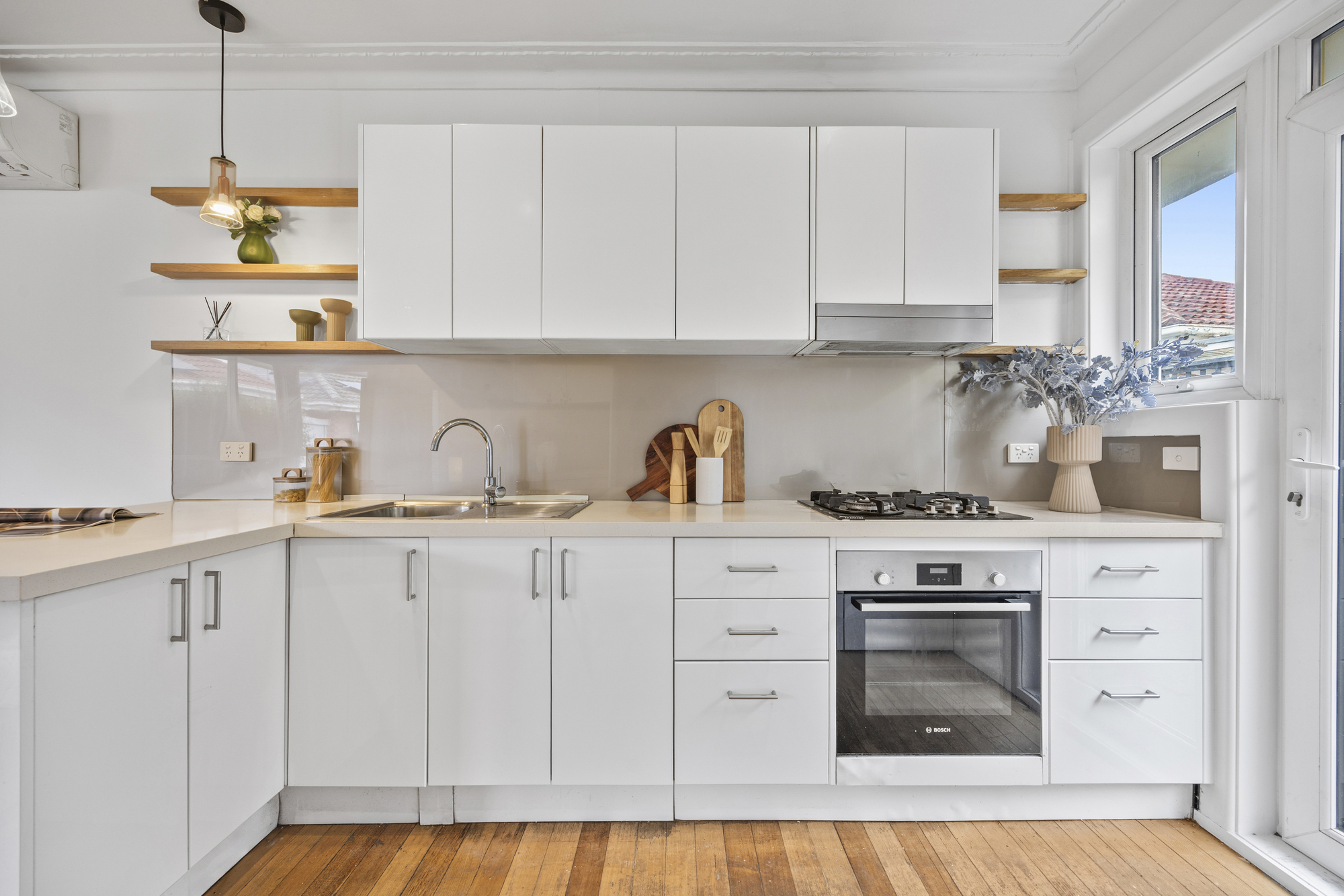 The kitchen is finished with stone benchtops and a glass splashback, and includes a Bosch electric oven and gas cooktop. A peninsula bench offers seating for two, while a European-style laundry is neatly integrated, maximising space and functionality.