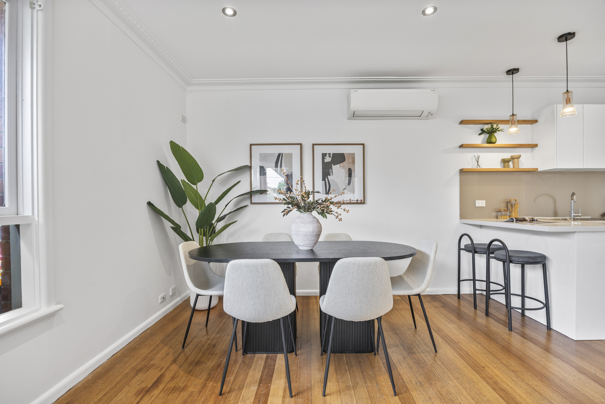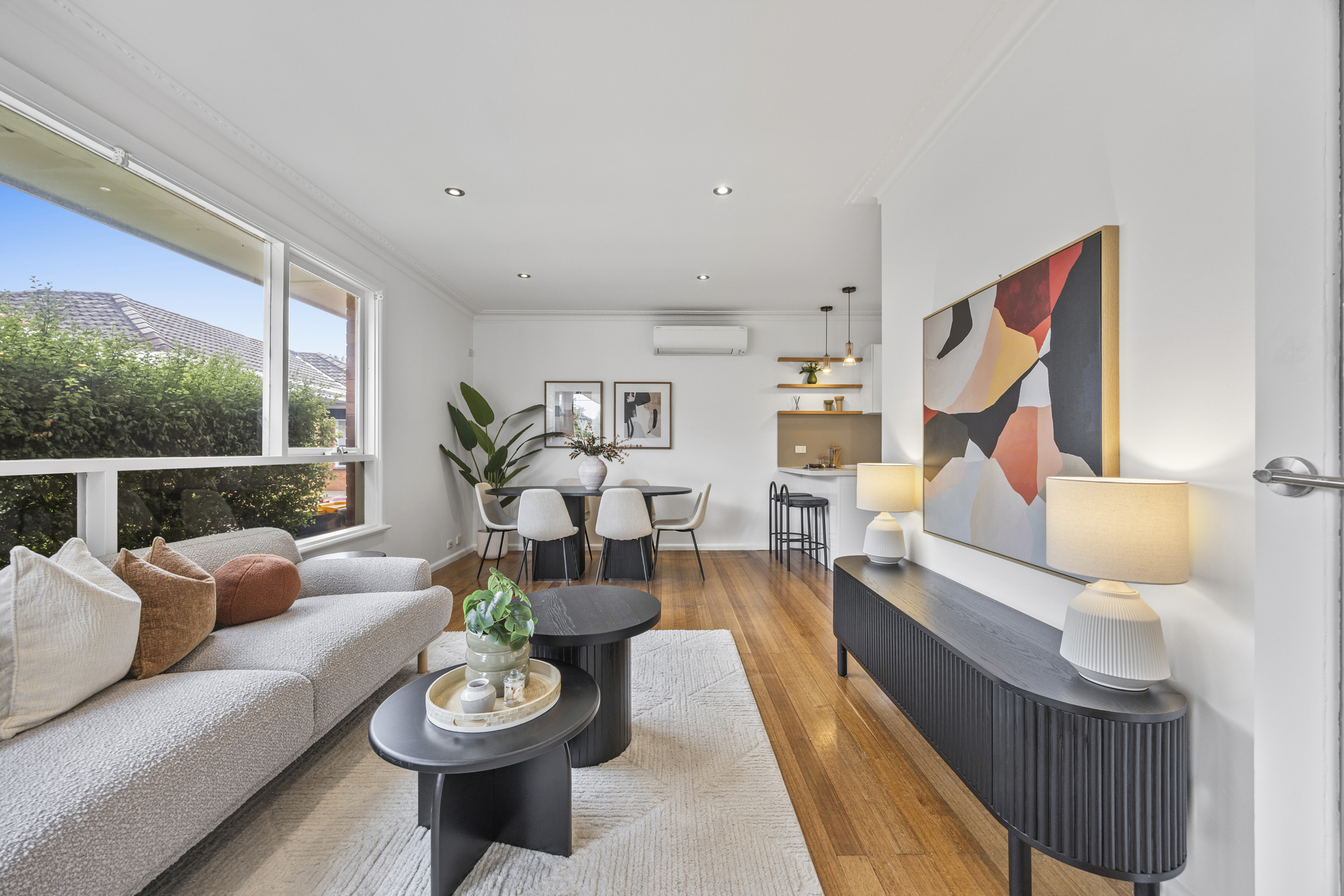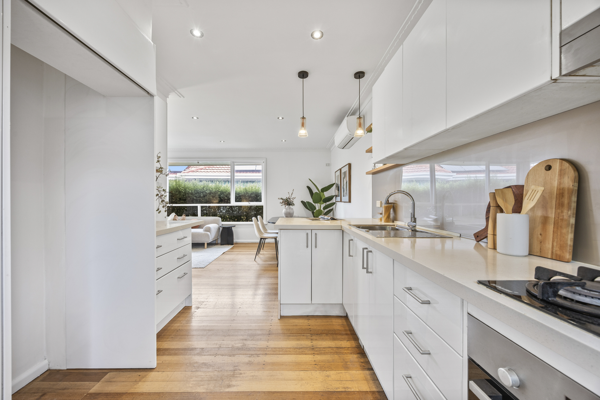 The open-plan living and dining zone is spacious and filled with natural light, featuring hardwood flooring throughout and a seamless connection to the kitchen, creating a functional layout for everyday living and entertaining. Split-system heating and cooling provide year-round comfort.