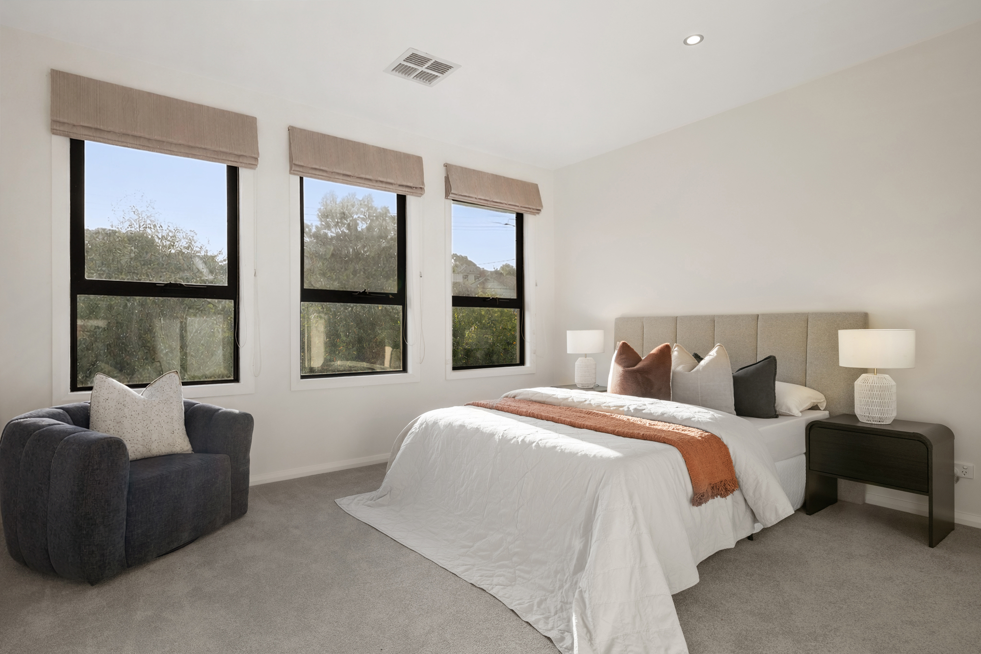 The master bedroom comes complete with a walk-in robe and a private ensuite, while the other two upstairs bedrooms are well-sized and feature built-in robes. These rooms are serviced by a central bathroom and a separate toilet. The study on the ground floor offers versatility, providing the option to function as a fourth bedroom, while the downstairs powder room and laundry with external access further enhance the home’s practical layout.