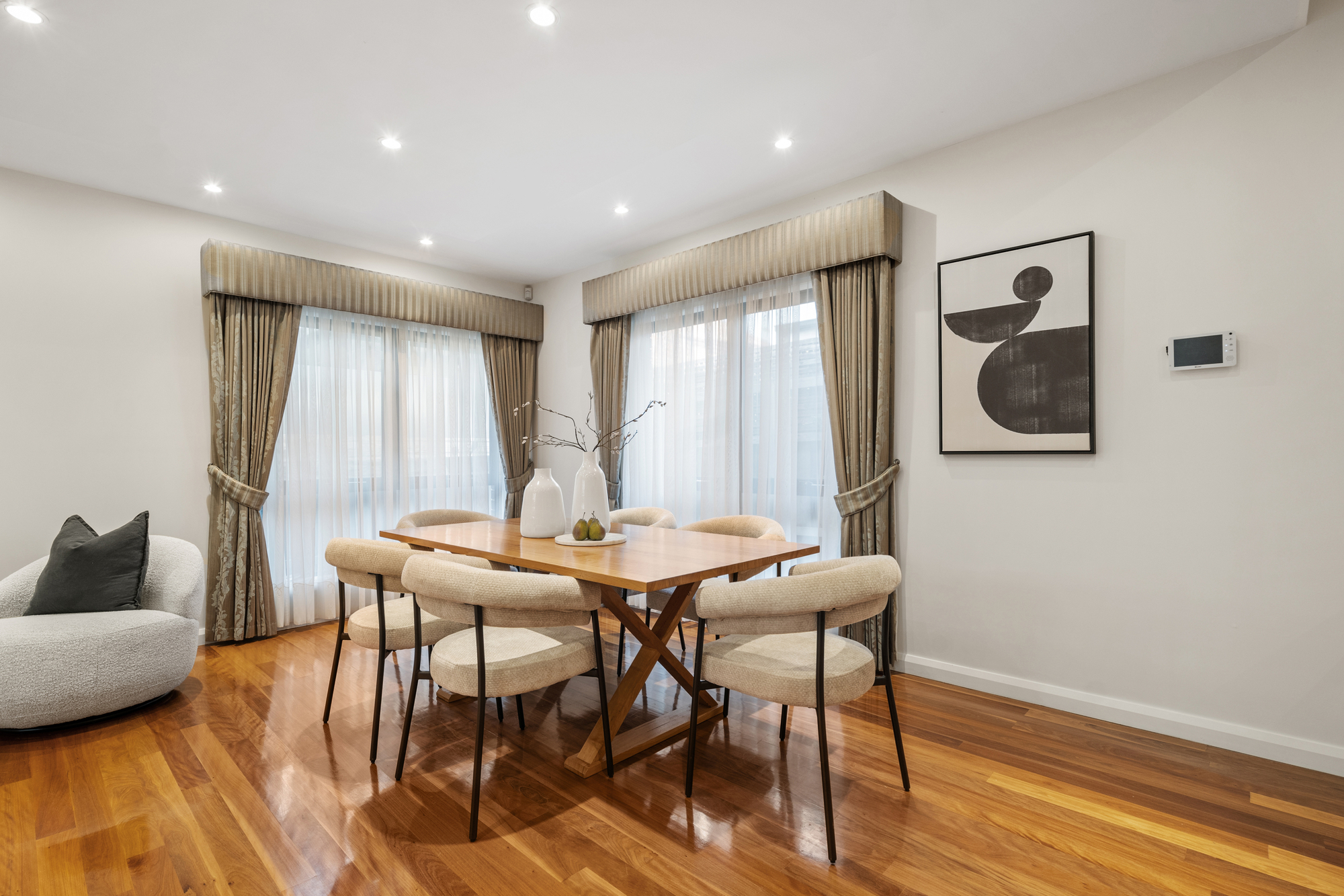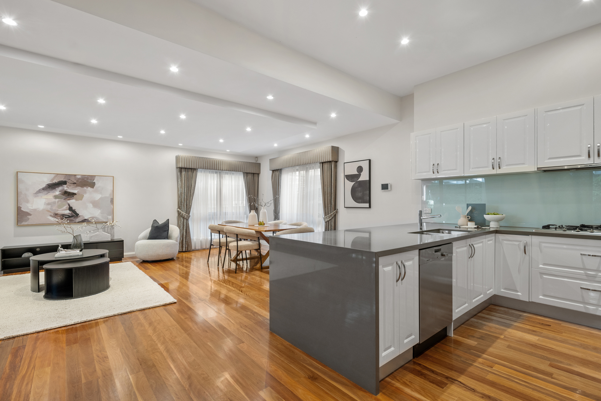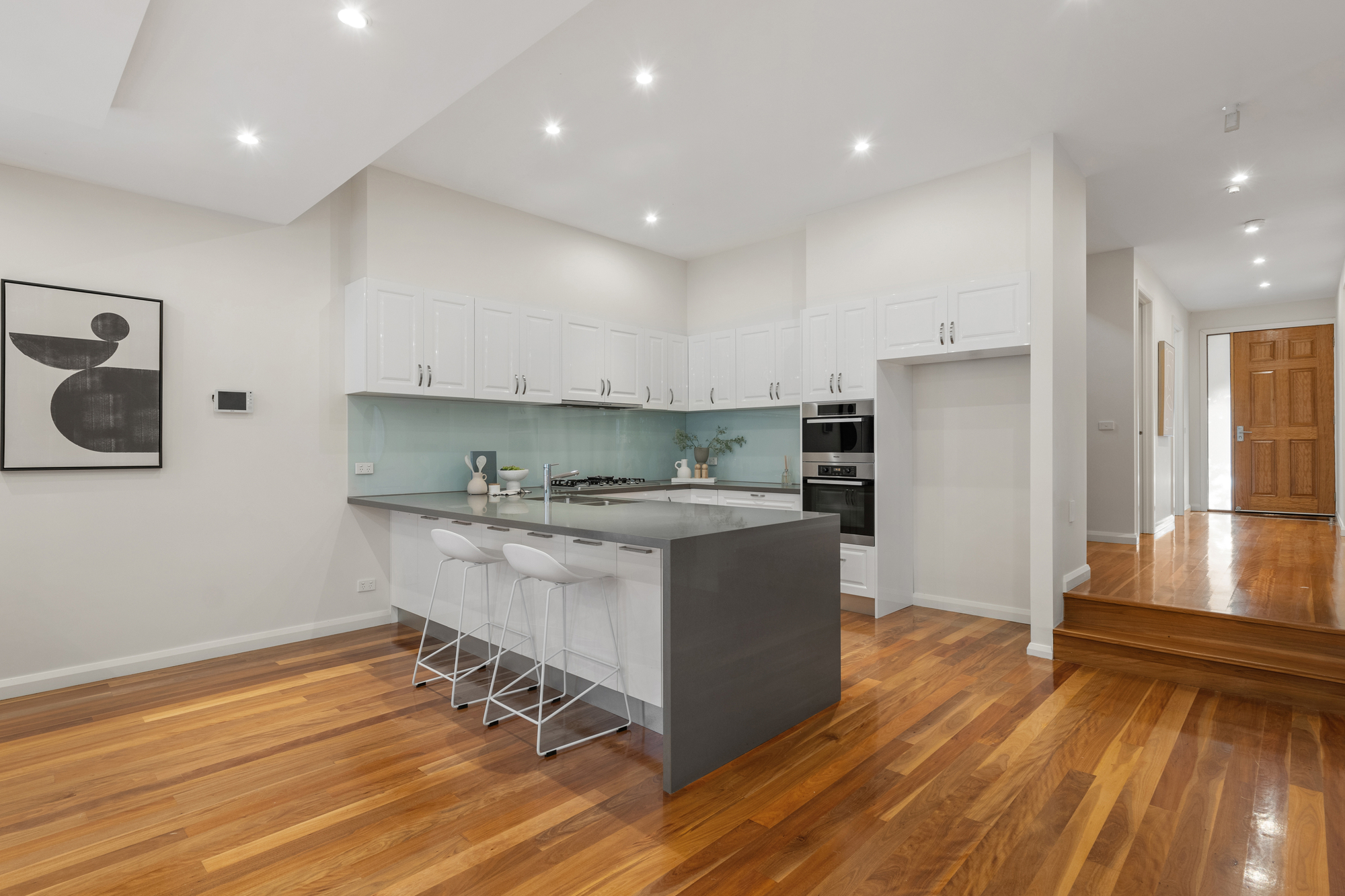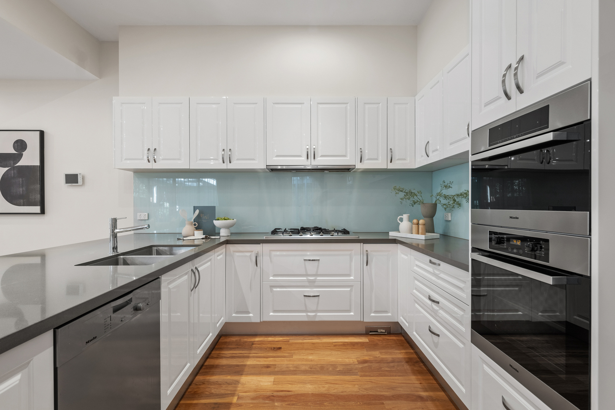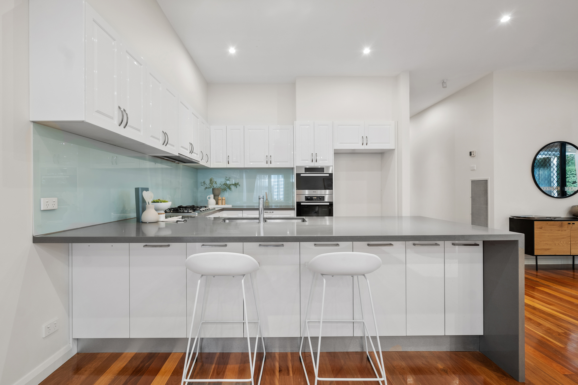 The modern kitchen is a chef’s dream, with gloss white cabinetry, grey stone benchtops, a glass splashback, and premium Miele appliances, including a 5-burner gas cooktop, dual electric ovens, and a dishwasher. The U-shaped kitchen with a waterfall edge provides a breakfast bar, perfect for casual dining, while the spacious dining and family areas are designed for both everyday living and entertaining. LED downlights and polished timber flooring throughout the ground floor add a touch of elegance, while ducted reverse cycle heating and cooling ensures comfort year-round.
