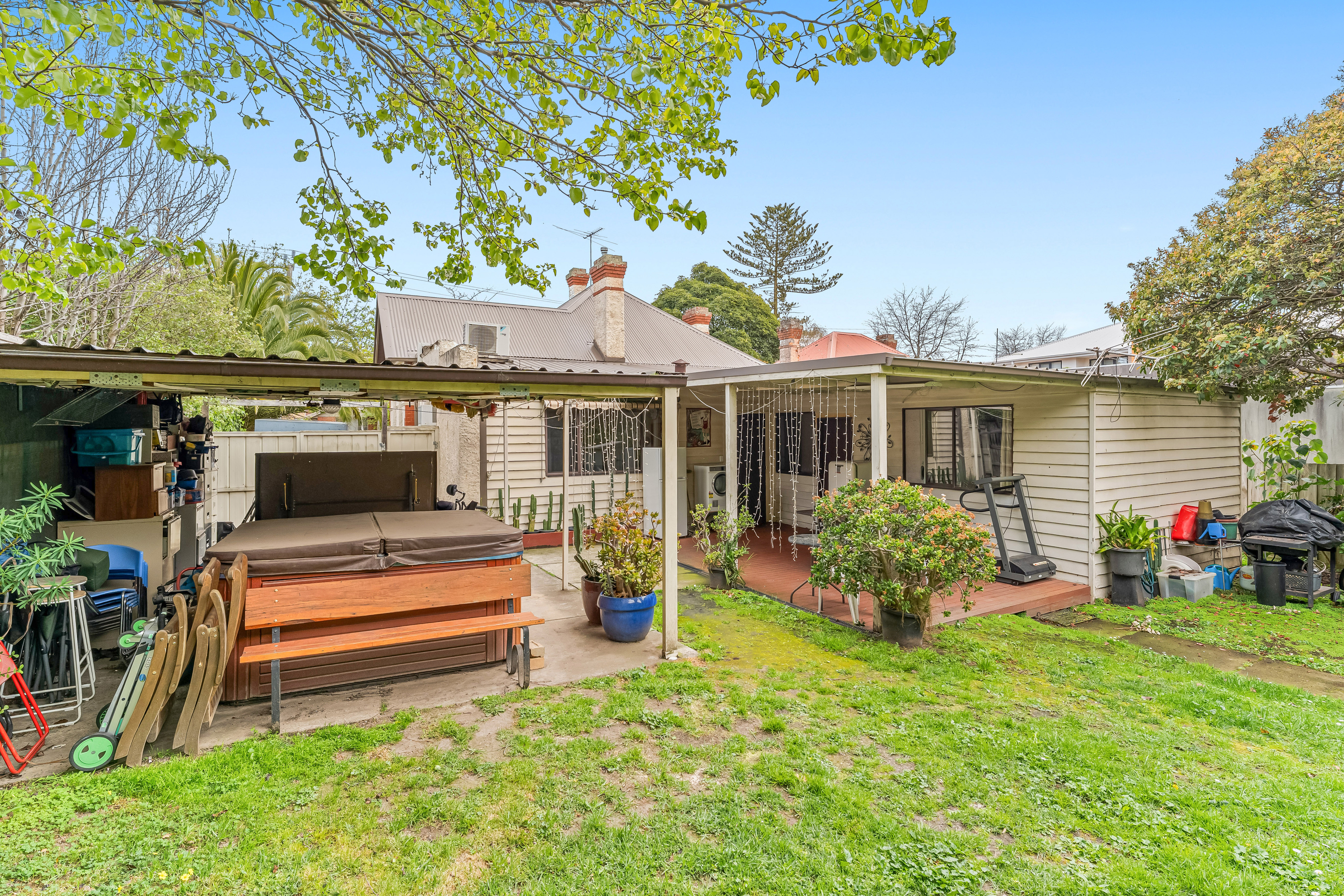 Outdoor spaces include a covered timber patio, landscaped gardens, a well-maintained backyard, and carport with laneway access. A shed and single car space add practicality. Unique elements such as multiple fireplaces, a solid front door, and a decorative ceiling in the living room highlight the character of the existing home.