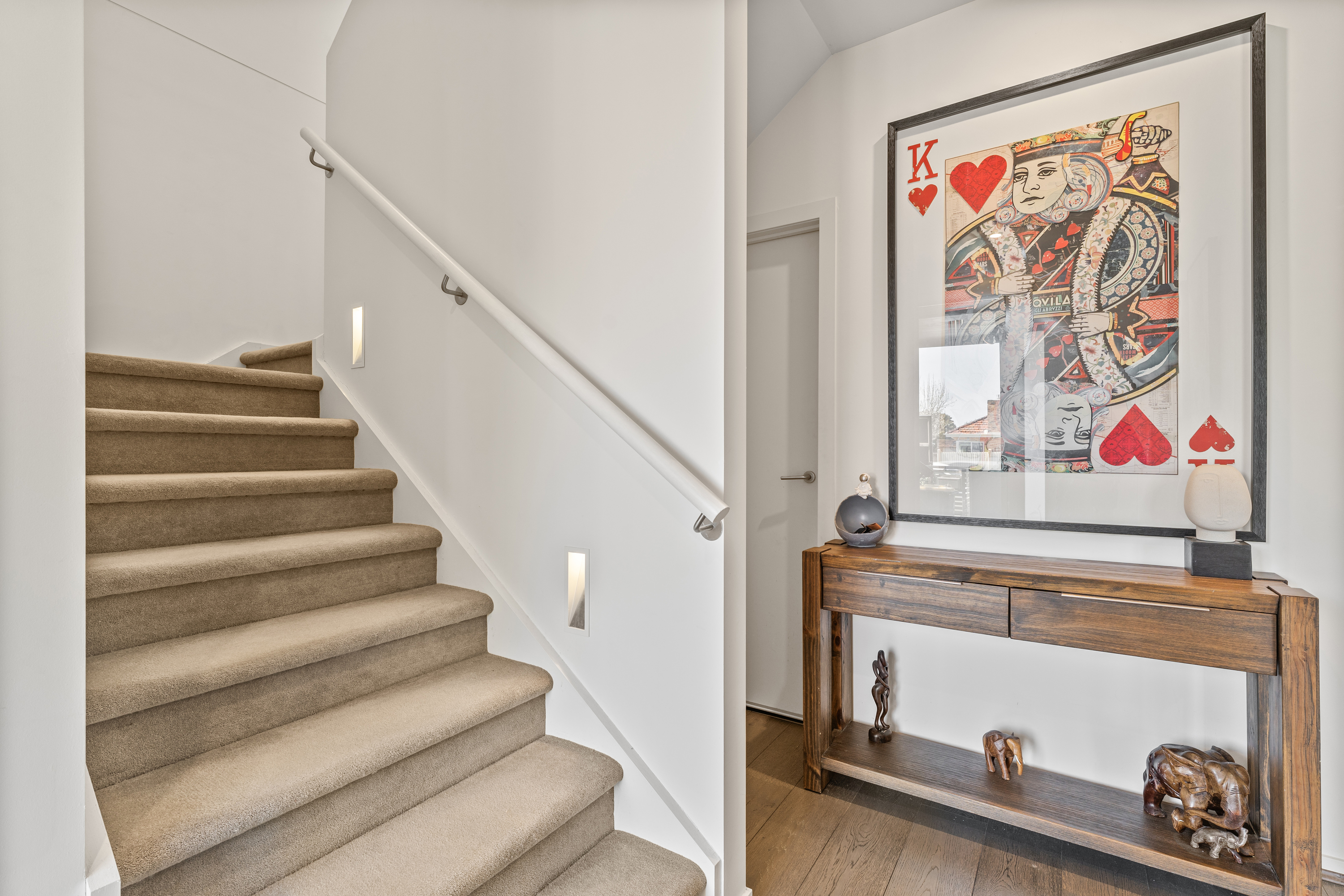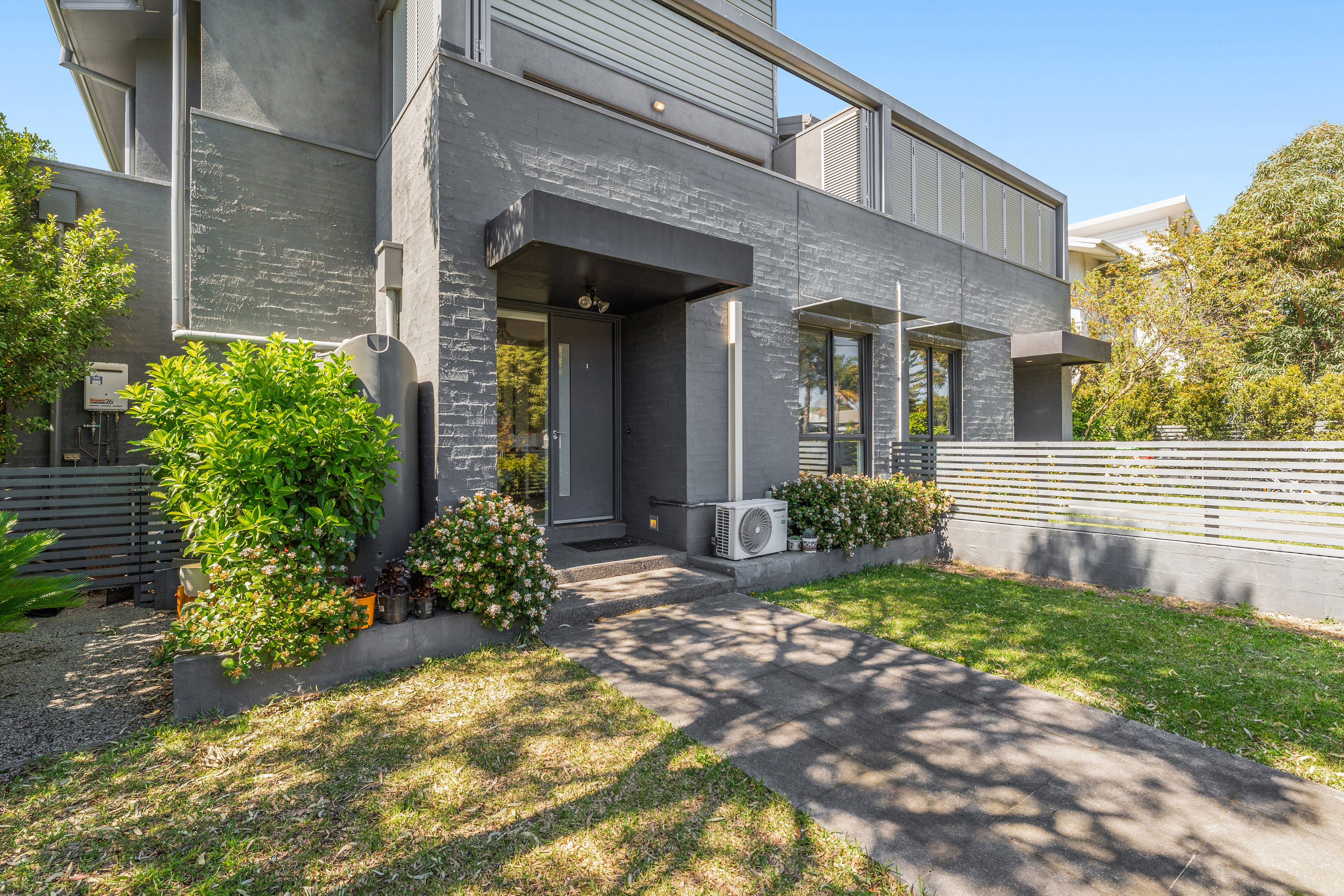 Accommodation is thoughtfully zoned, with two ground-floor bedrooms featuring built-in robes, while the upstairs main bedroom offers a walk-in robe and ensuite access. All bedrooms are finished with timber flooring for a cohesive style. The bathroom includes mirrored storage, and a laundry is conveniently located within the garage. Outdoors, the front yard is landscaped for low-maintenance living, while the upstairs balcony provides a versatile entertaining space. Parking is provided with a single car space.