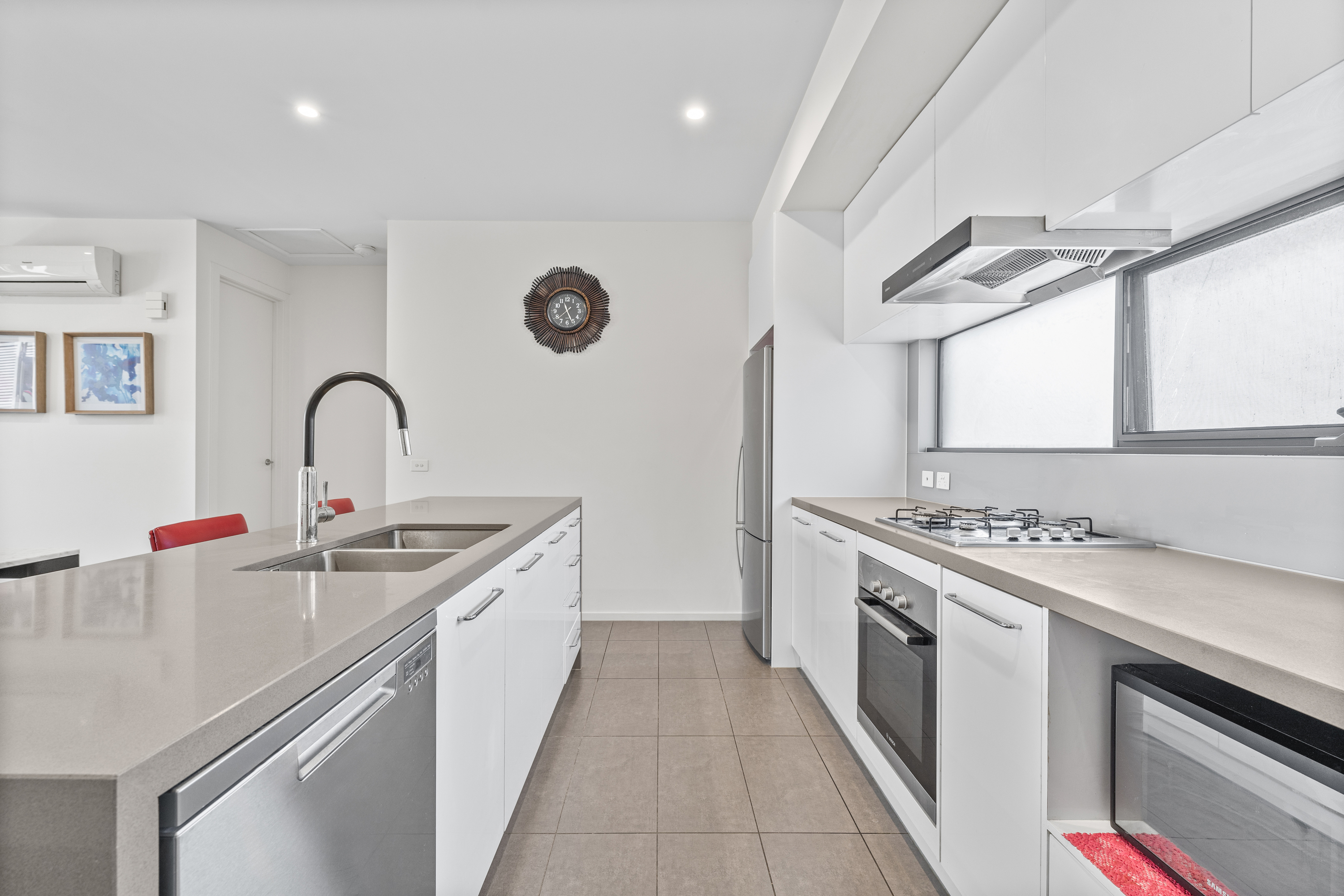 The open-plan living, dining, and kitchen area is finished with timber flooring throughout and complemented by a split-system air conditioner. Sliding doors connect the space to a large upstairs balcony with operable shades, creating an extension of the living area that is perfect for year-round enjoyment. The kitchen is equipped with a four-burner gas stove, island bench, two full-sized sinks, and generous over and under storage.