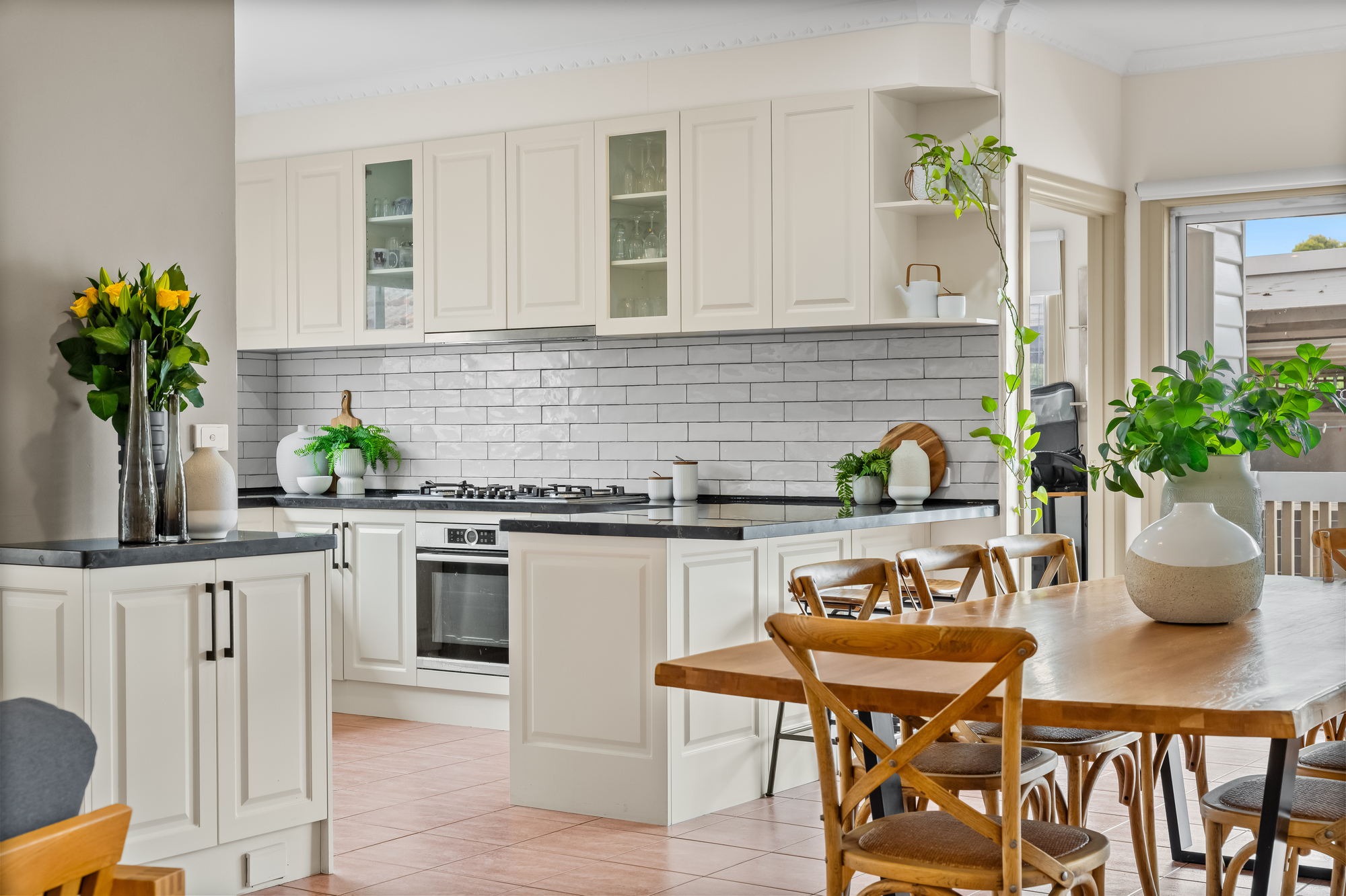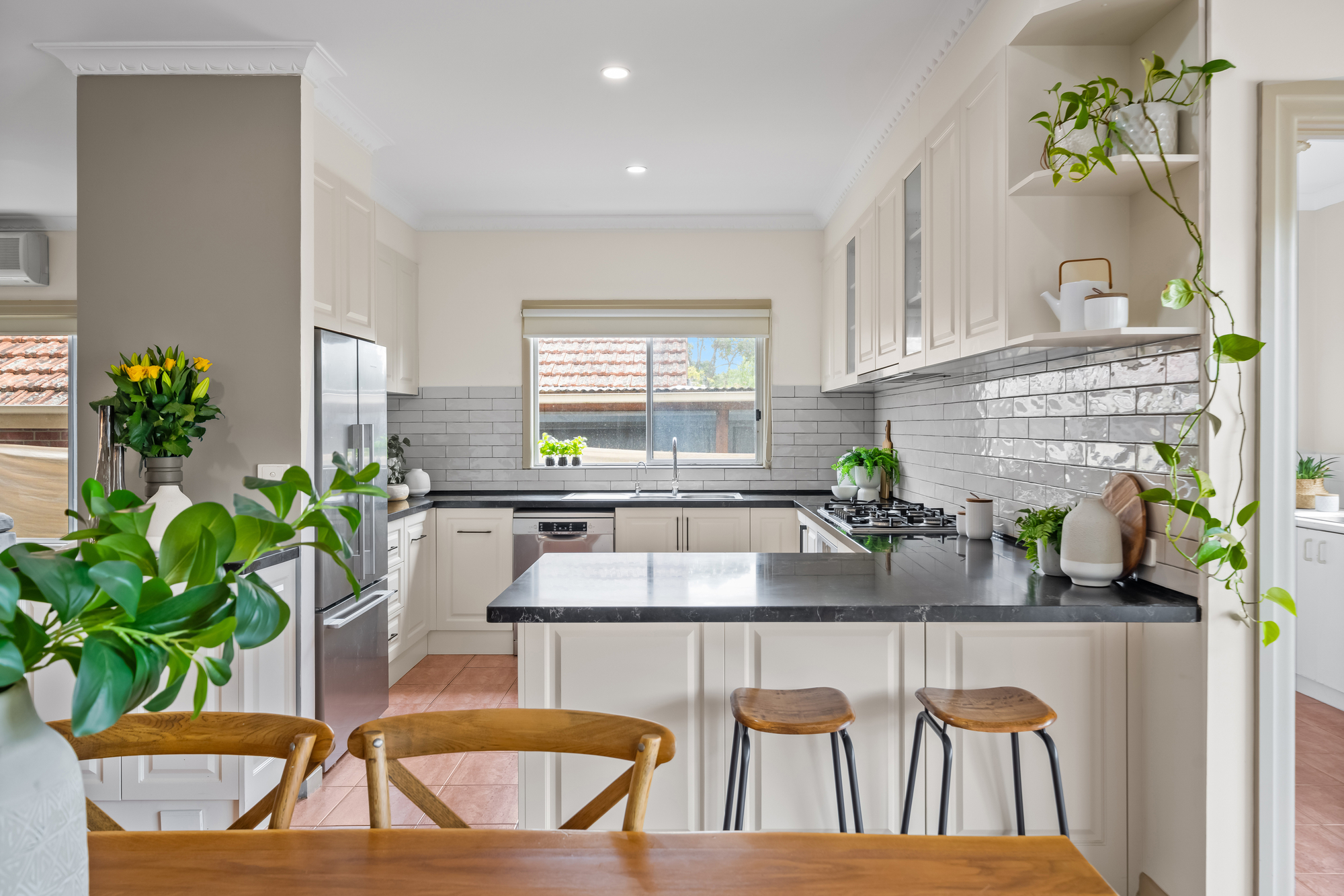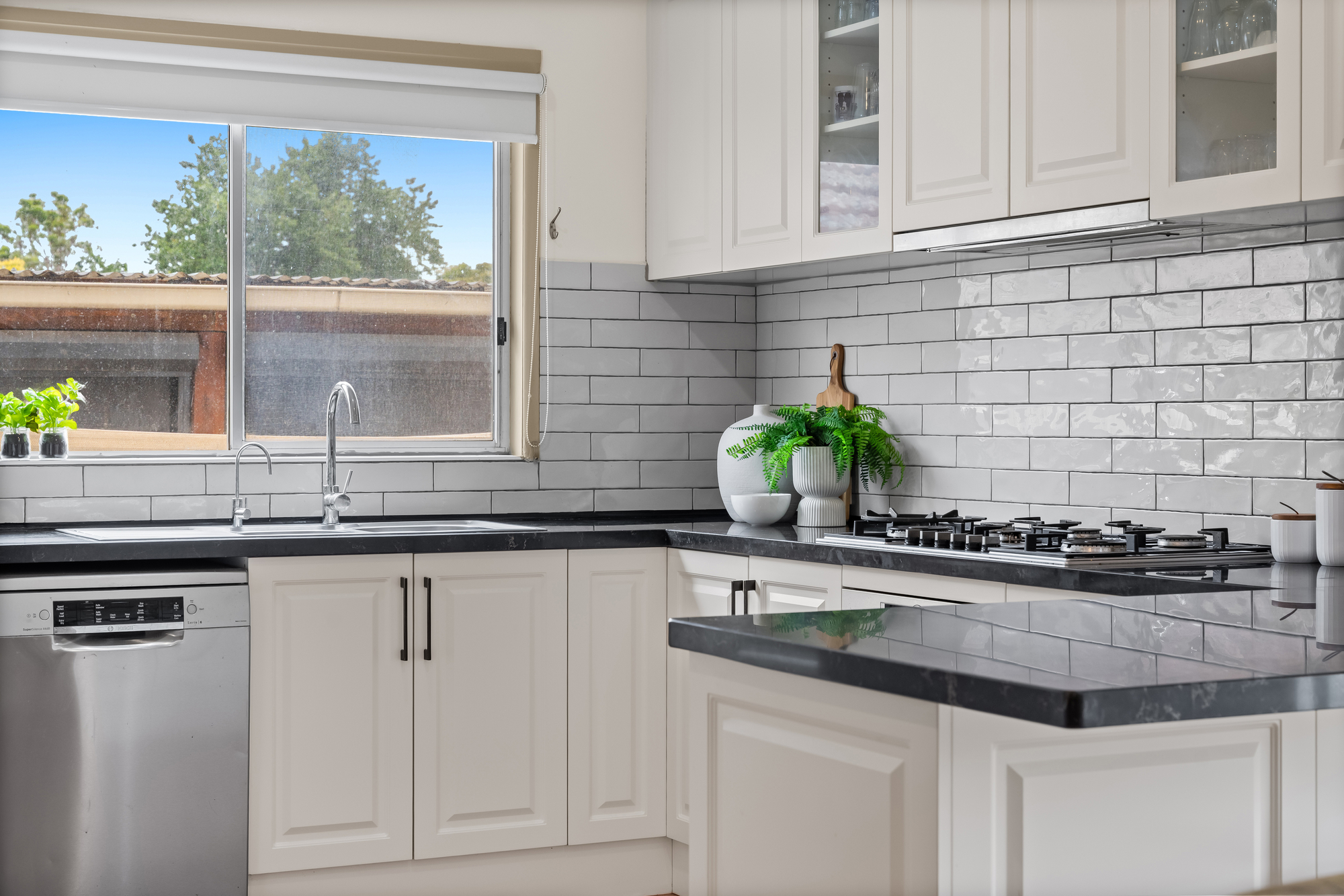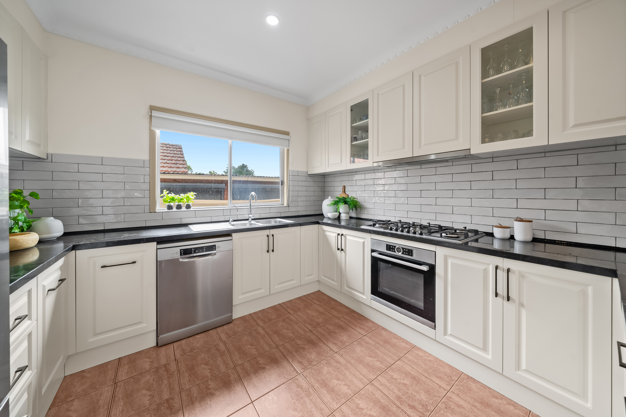 The kitchen offers excellent bench and storage space, finished with timber cabinetry, a tiled splashback, and a freestanding oven and cooktop. A window above the sink provides natural light and ventilation, while the adjoining dining area is perfect for daily use.
