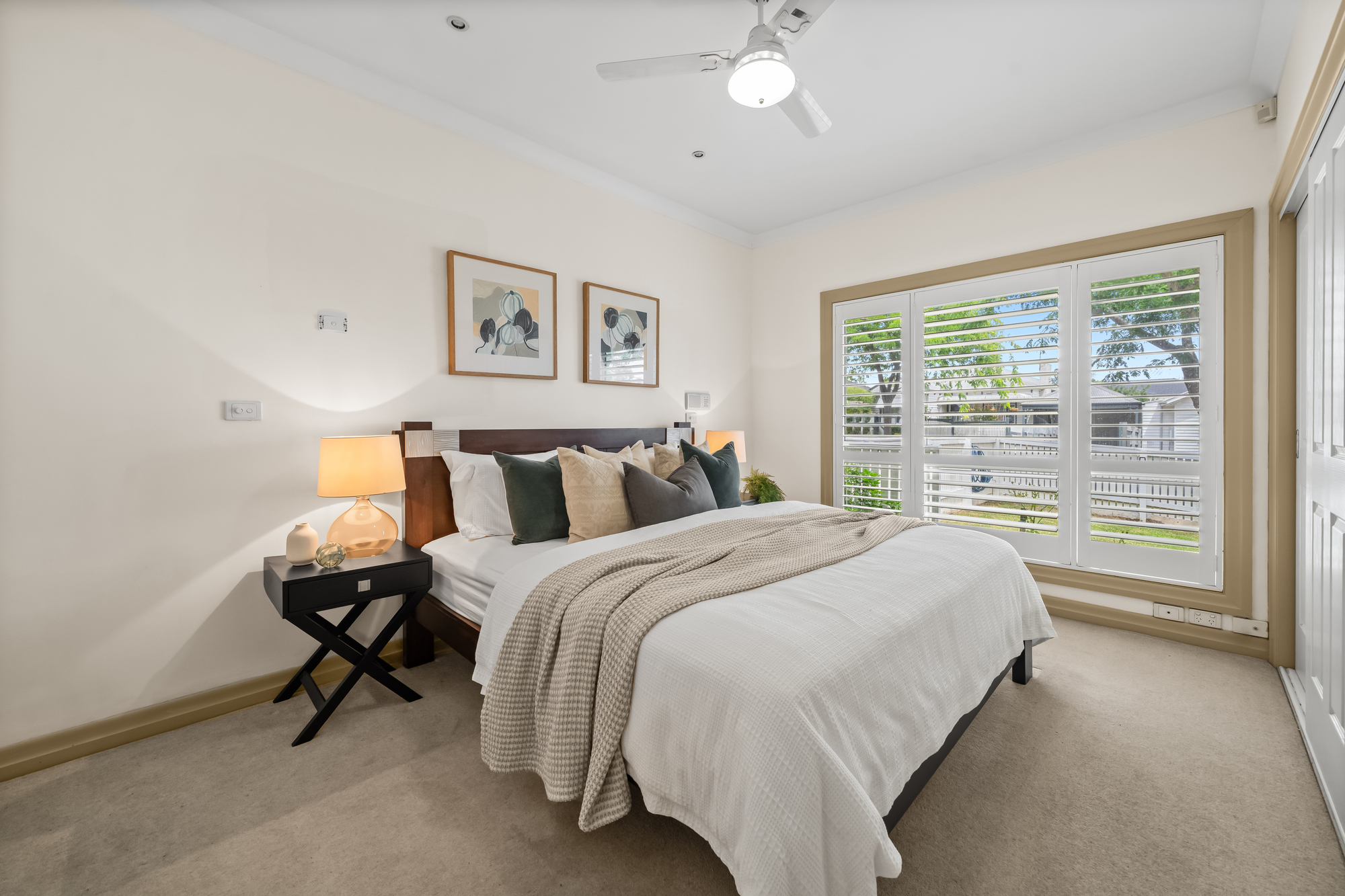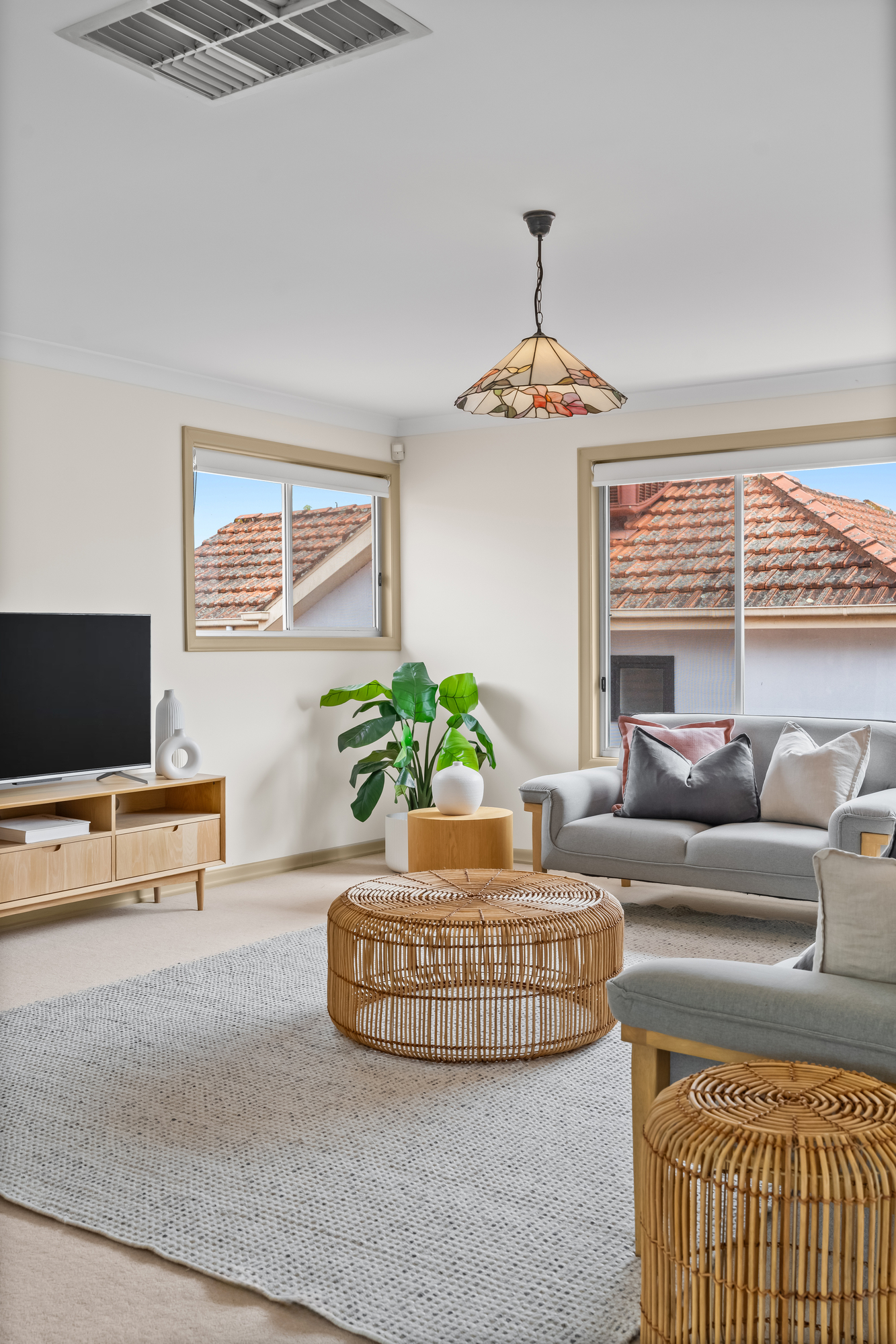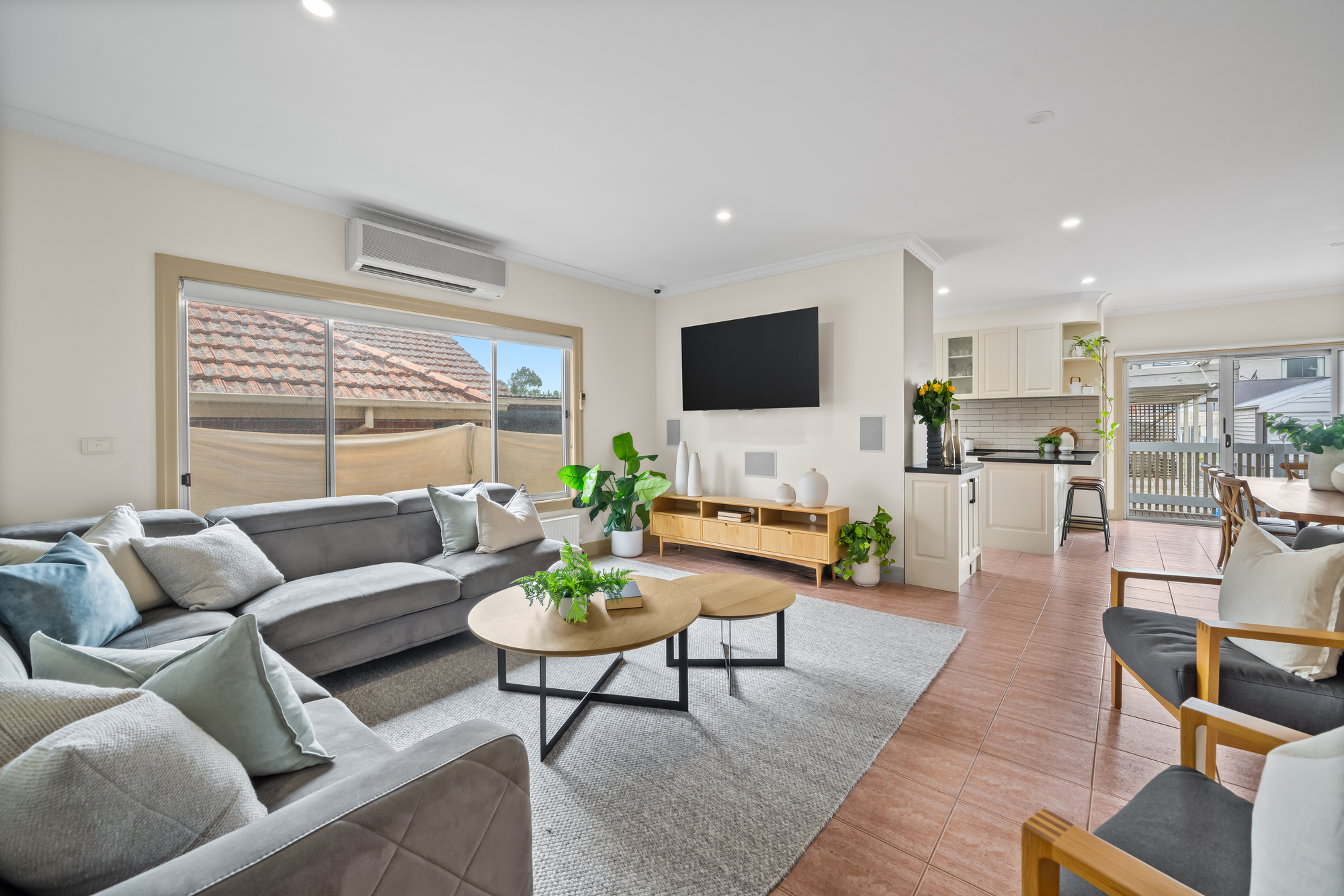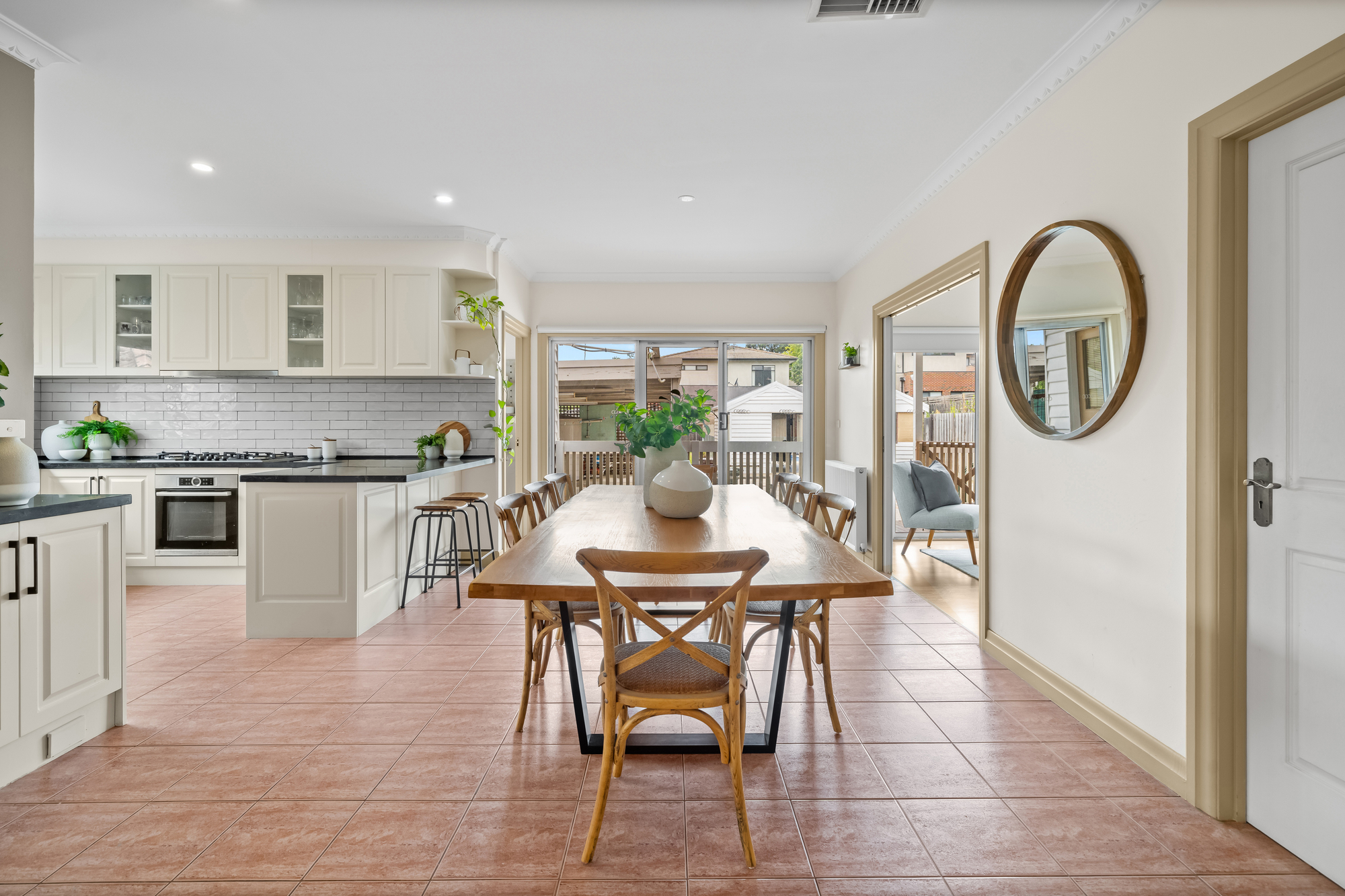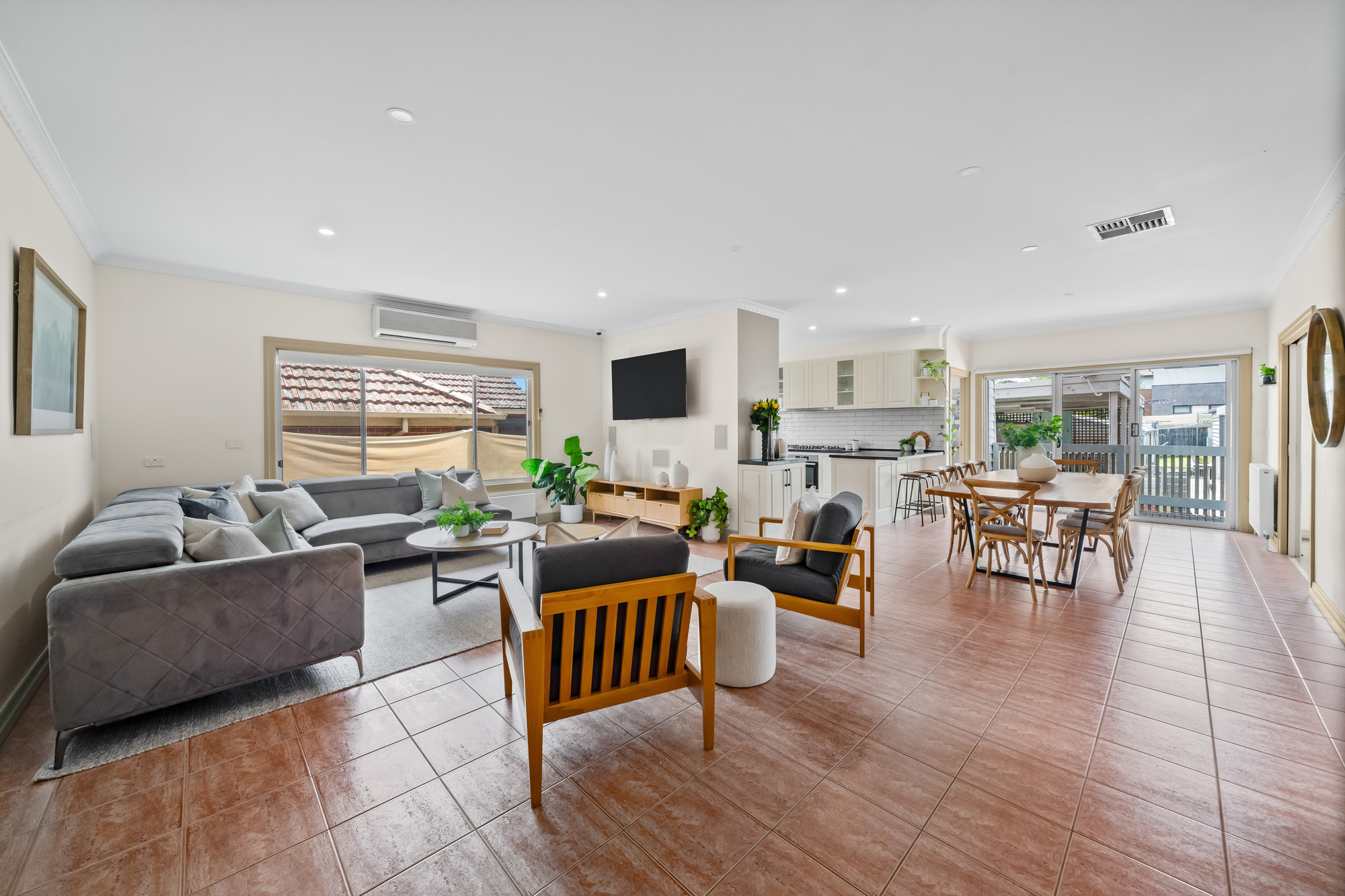 The ground floor features a light-filled open-plan living and dining area with timber flooring, neutral tones, and generous proportions. Large windows enhance natural light, while the seamless connection to the kitchen supports everyday living and entertaining. Comfort is provided by hydronic heating, evaporative cooling, and split-system air conditioning.