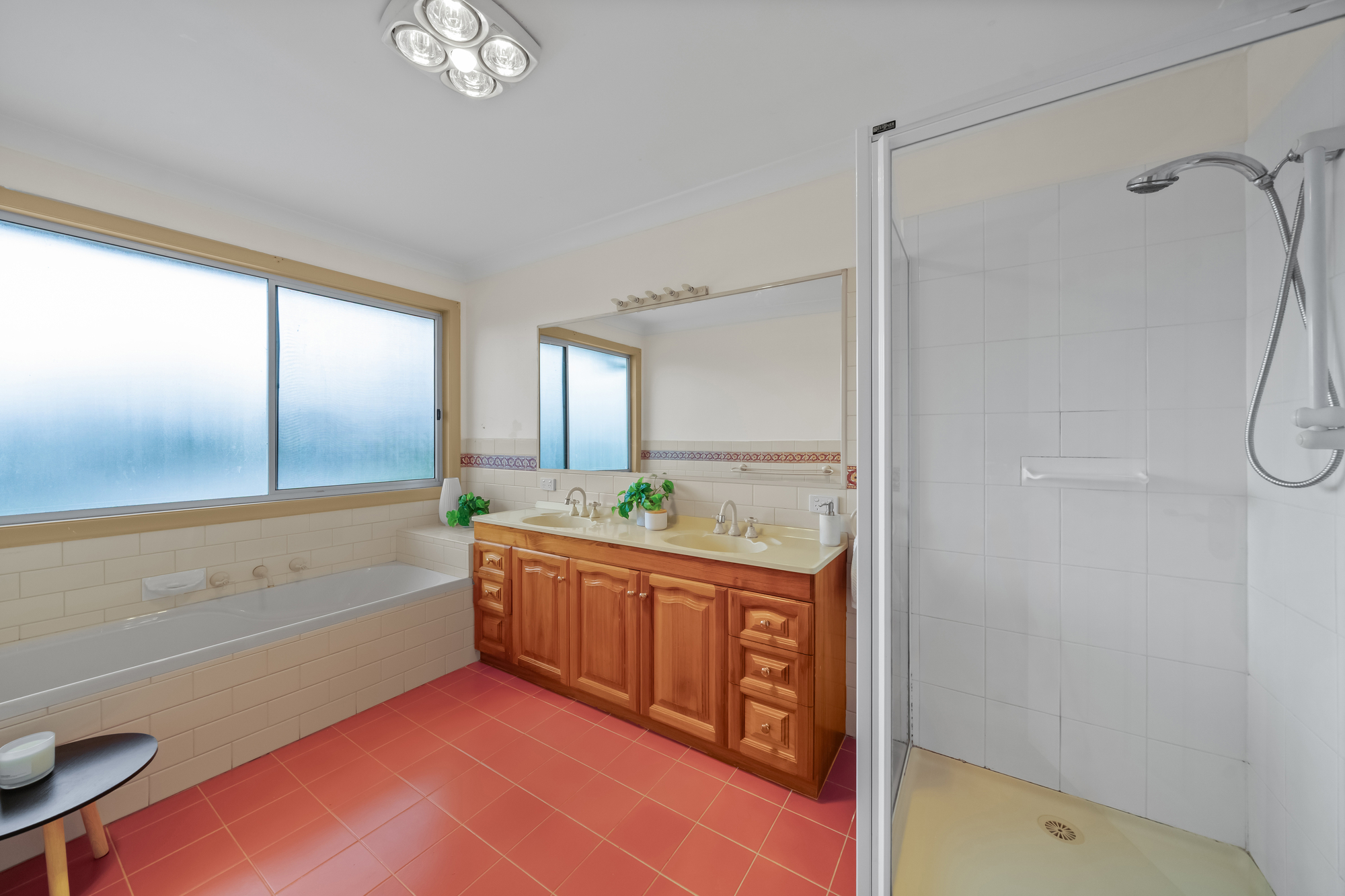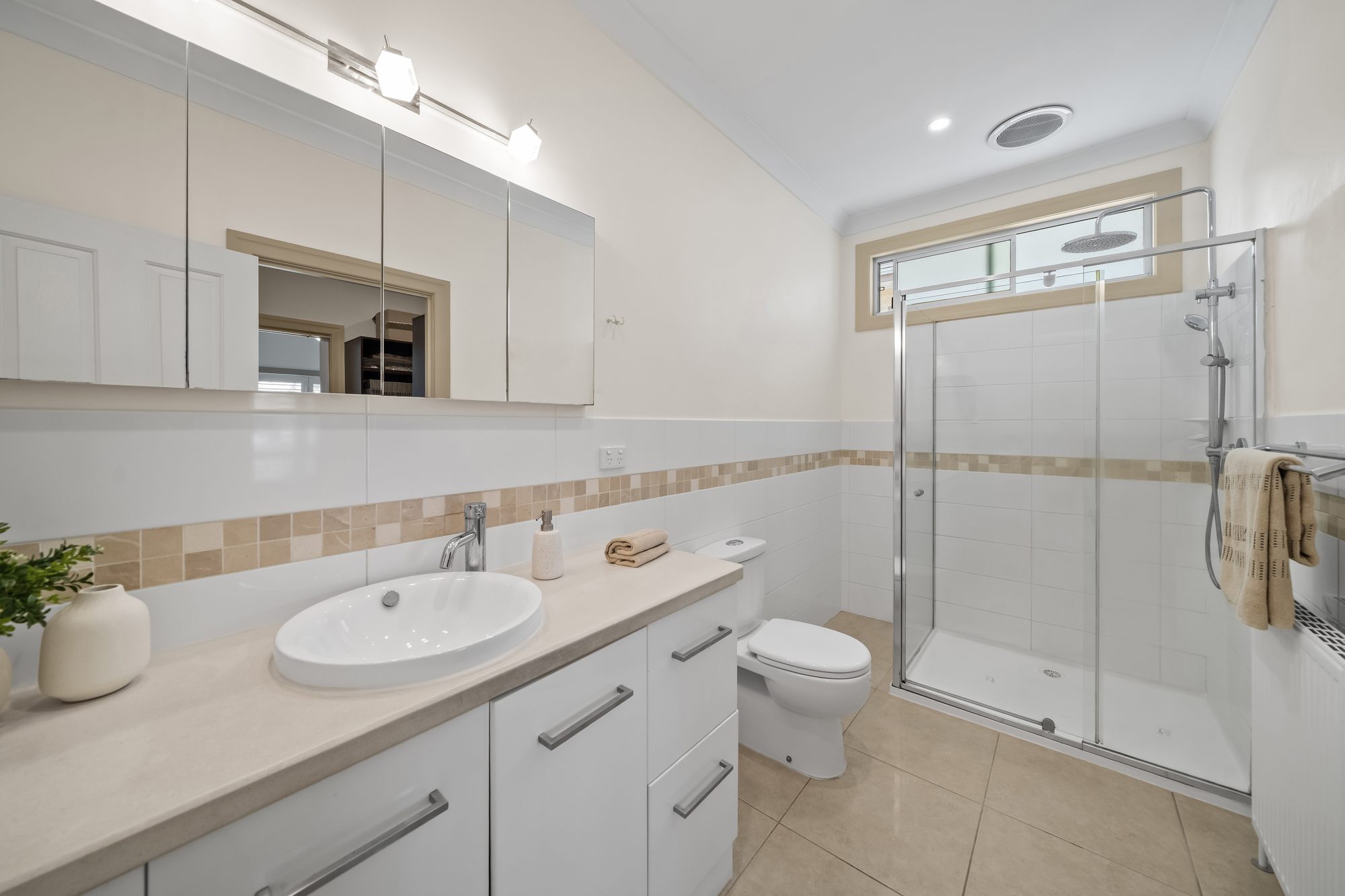 Accommodation is well zoned across both levels, with five bedrooms in total. The master is generously proportioned and includes a walk-in robe and private ensuite. Three additional bedrooms are located upstairs, all with built-in robes, while two larger bedrooms downstairs provide flexibility for guests, extended family, or home office use.