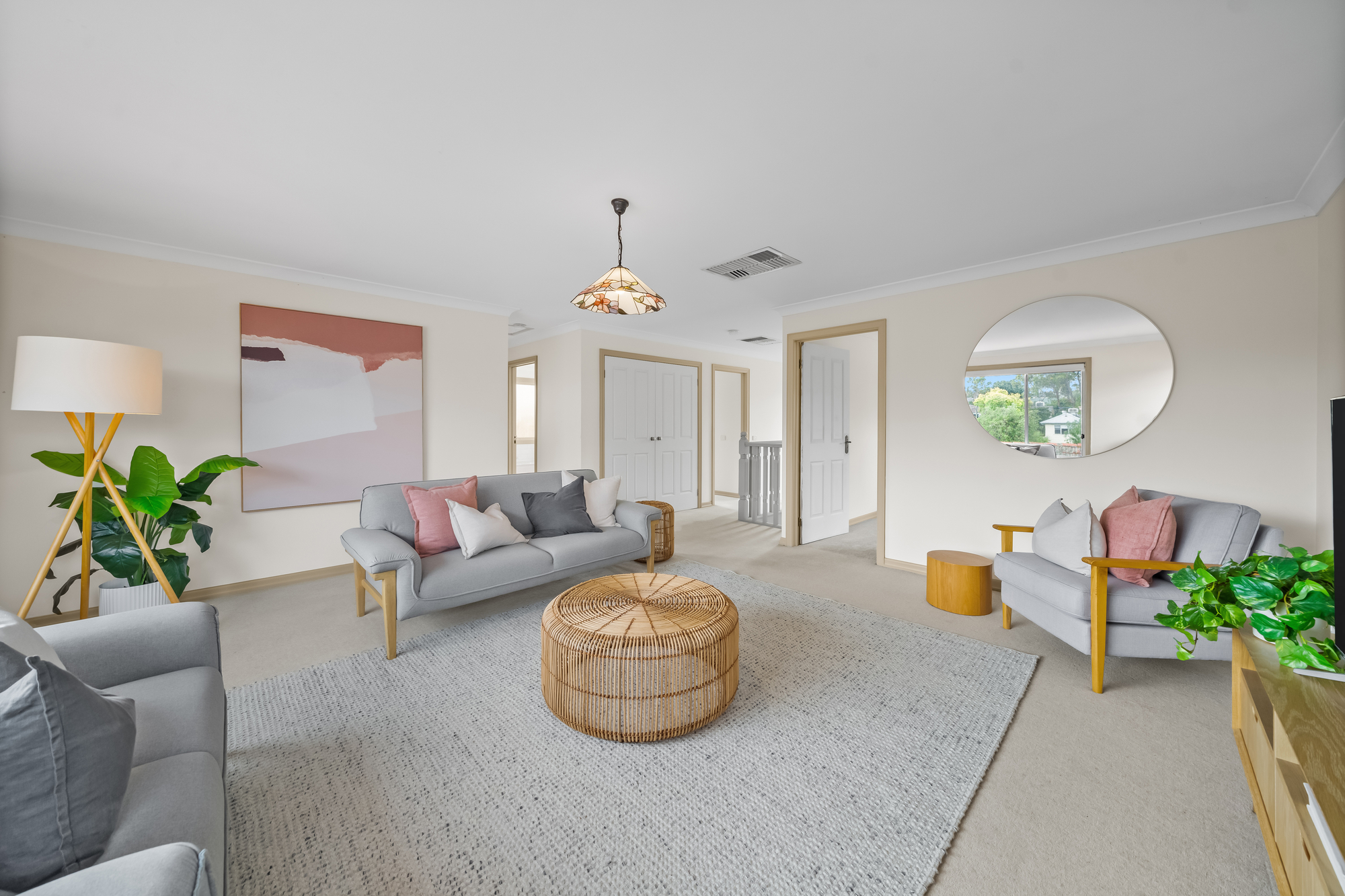 Three bathrooms are distributed throughout the home, offering family-sized layouts with a mix of showers and bathtubs, neutral finishes, and ample storage. An upstairs retreat provides a quiet second living space, complemented by a dedicated home office and a downstairs rumpus or entertainment room, allowing clear separation of living zones.
