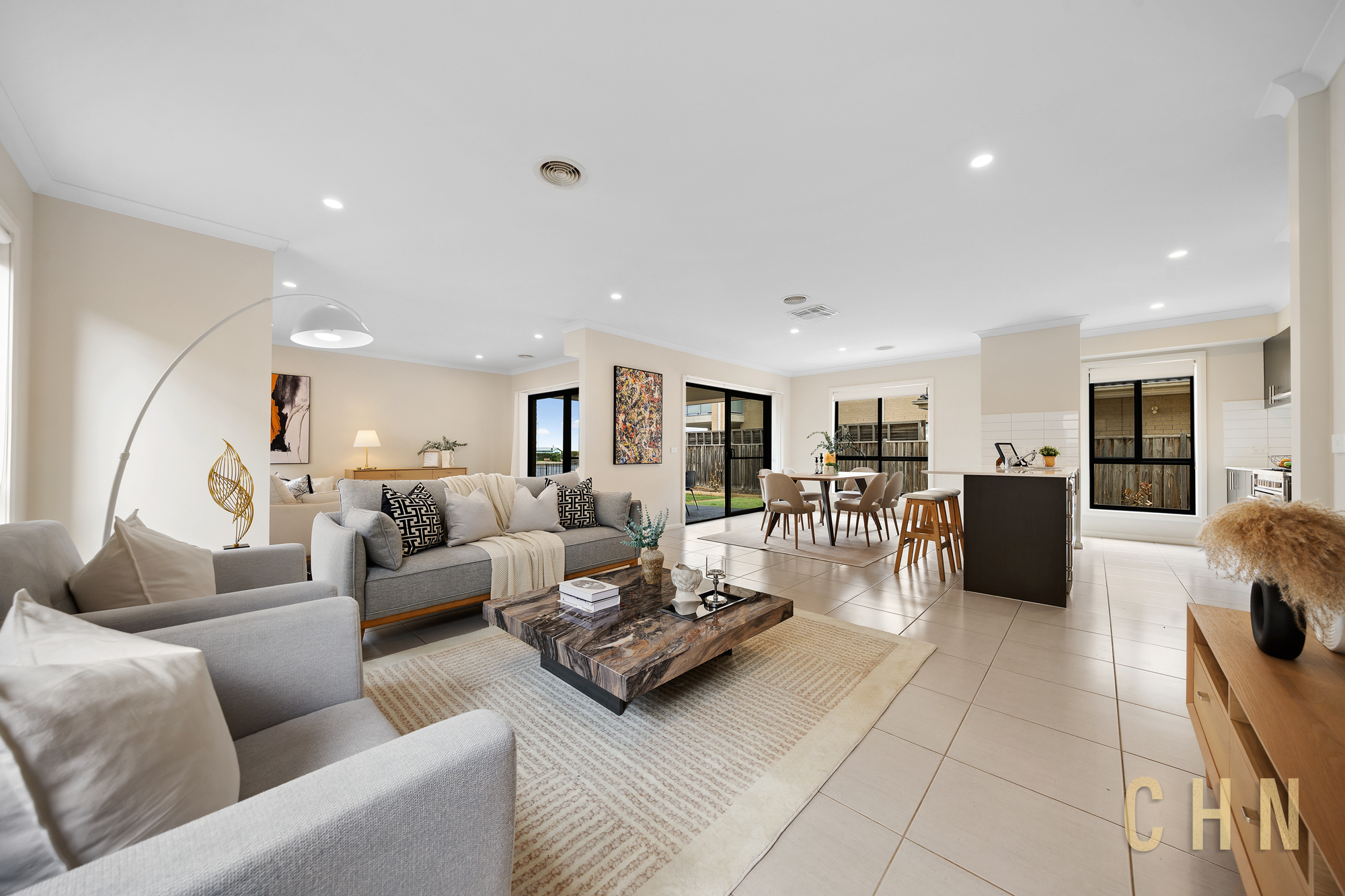 The open-plan kitchen is well appointed with 900mm appliances, splashback tiling, and a walk-in pantry, flowing seamlessly into the main living and dining areas. Comfort is assured year-round with evaporative cooling, ducted heating, and LED downlights throughout.