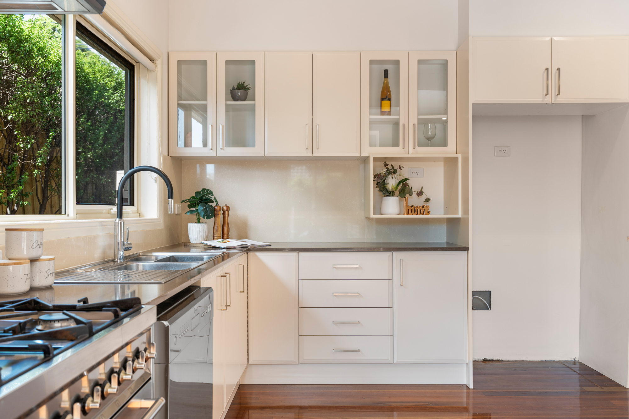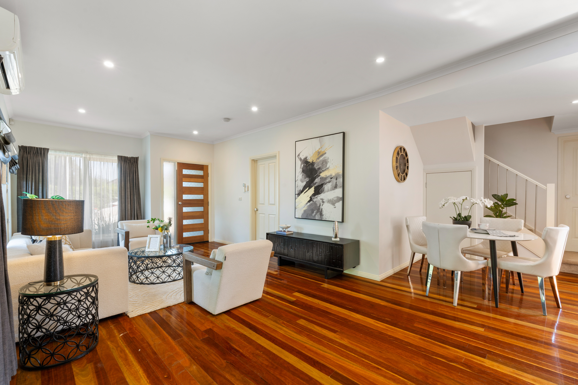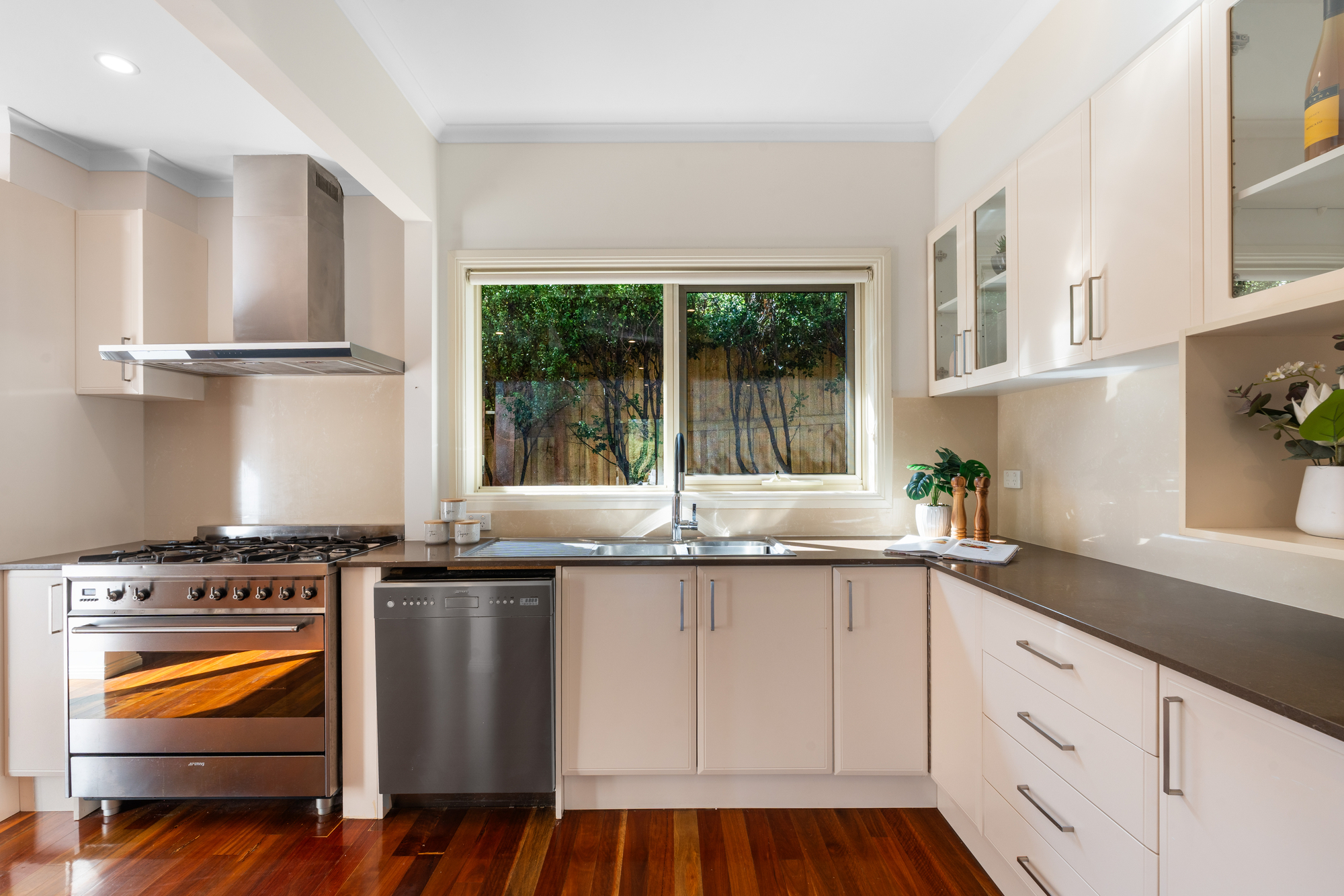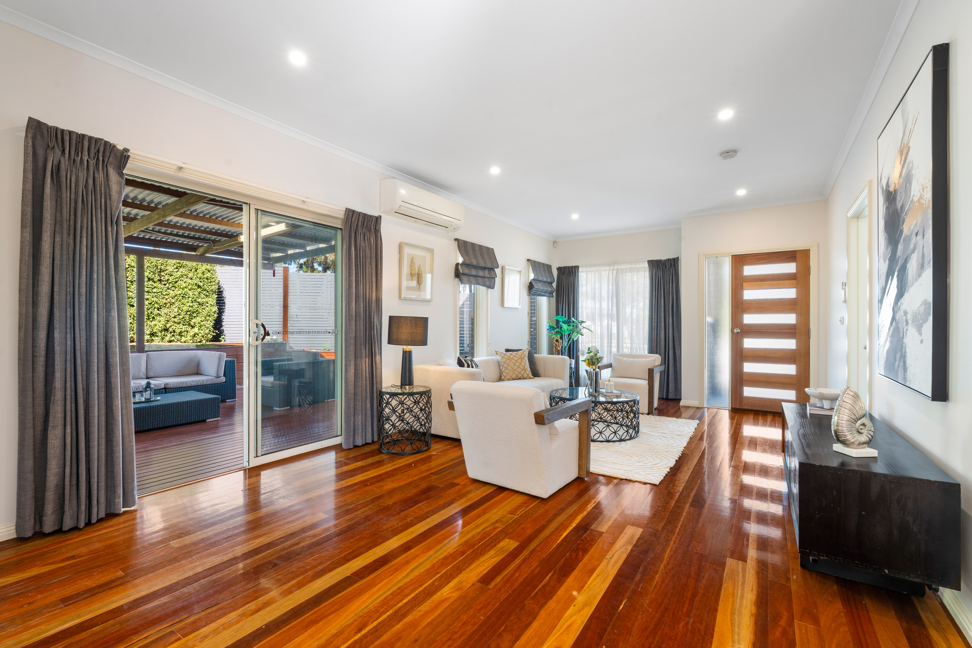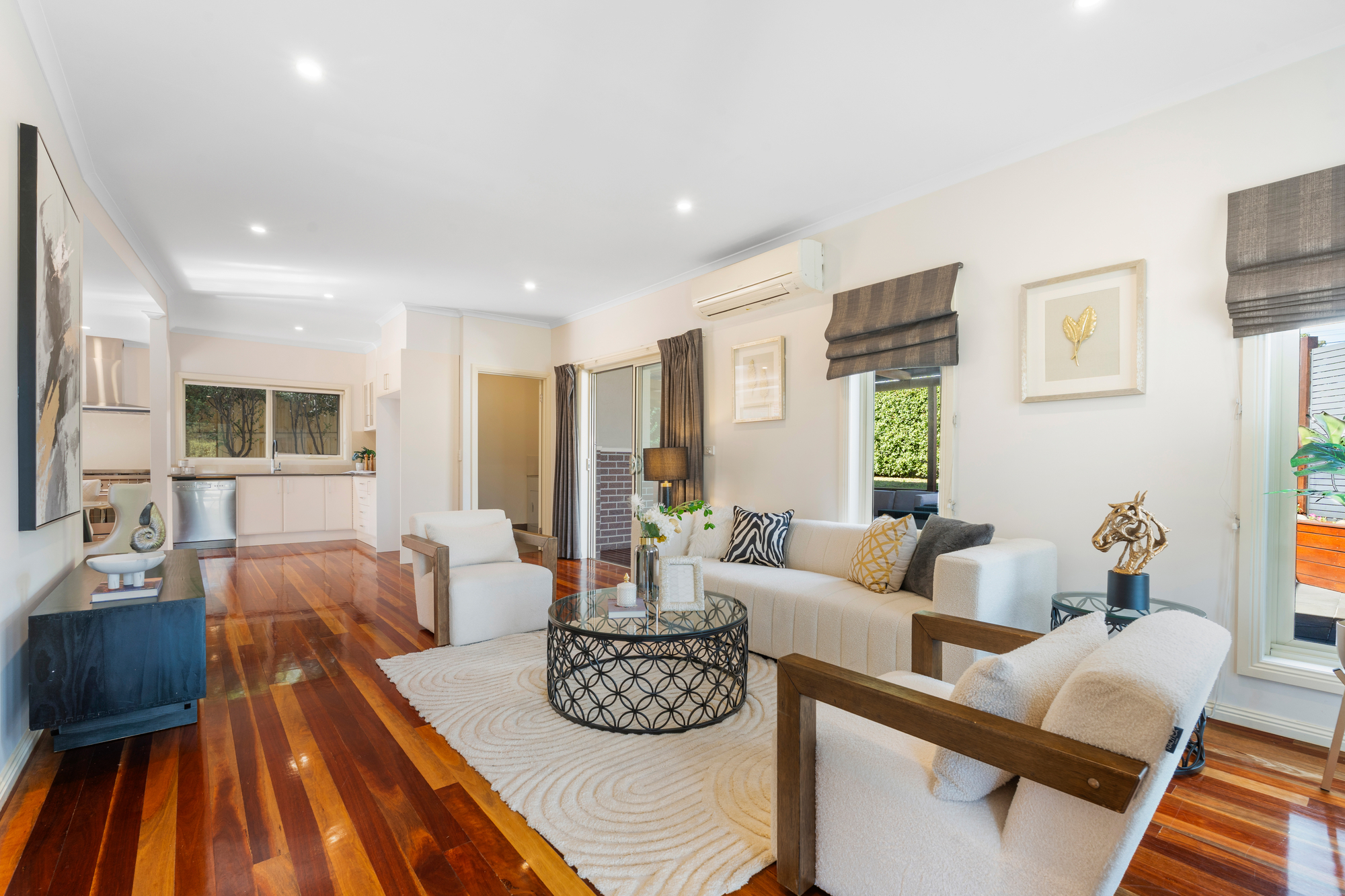 Step inside to find an interior defined by gleaming hardwood floorboards and an abundance of natural light. The heart of the home is the sleek, well-appointed kitchen, featuring premium stainless steel Smeg appliances and stone surfaces. It flows effortlessly into the open-plan meals and informal living area, while a separate, inviting lounge provides a quiet retreat, equipped with its own Mitsubishi split system air conditioner for year-round comfort.