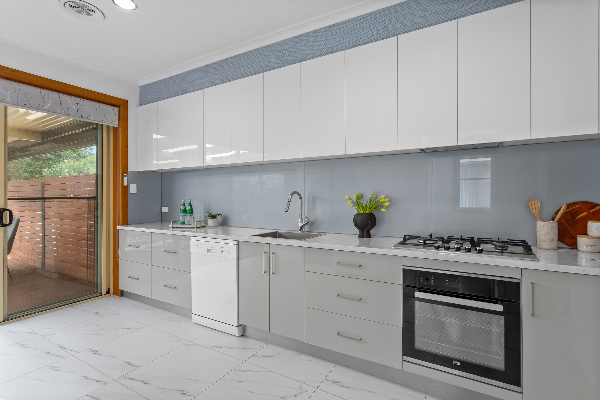 The kitchen is generous in size and designed for everyday functionality, with room for a meals table creating an open kitchen and dining connection. A glass splashback, five burner gas cooktop, electric oven and dishwasher are complemented by ample storage and preparation space, making it well suited to family life.