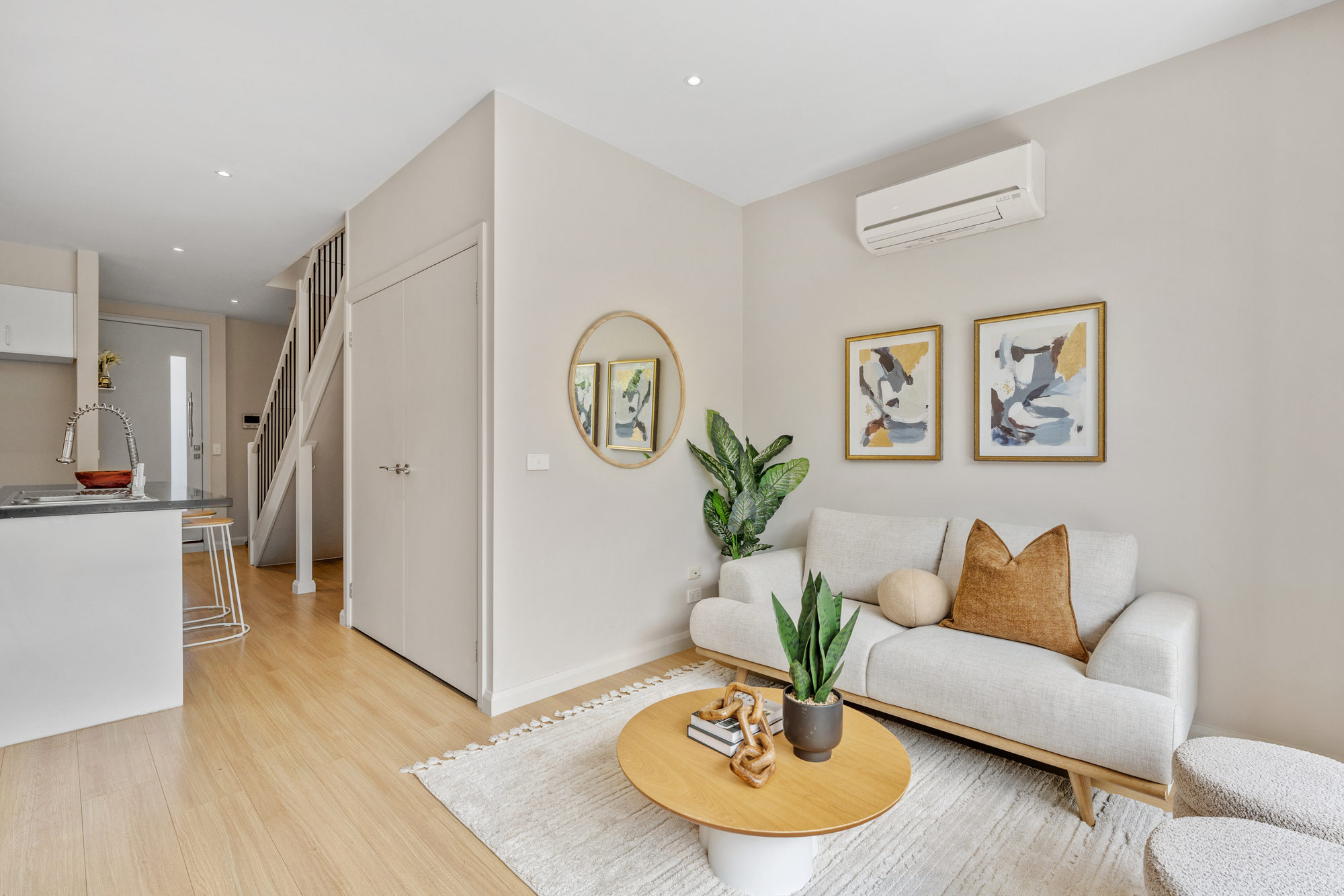 Bathrooms are finished with floor-to-ceiling tiling, stone benchtops, mirror storage, and dual-head rainfall showers. A powder room is located on the ground level for added convenience, while a hidden laundry is neatly tucked beneath the staircase.