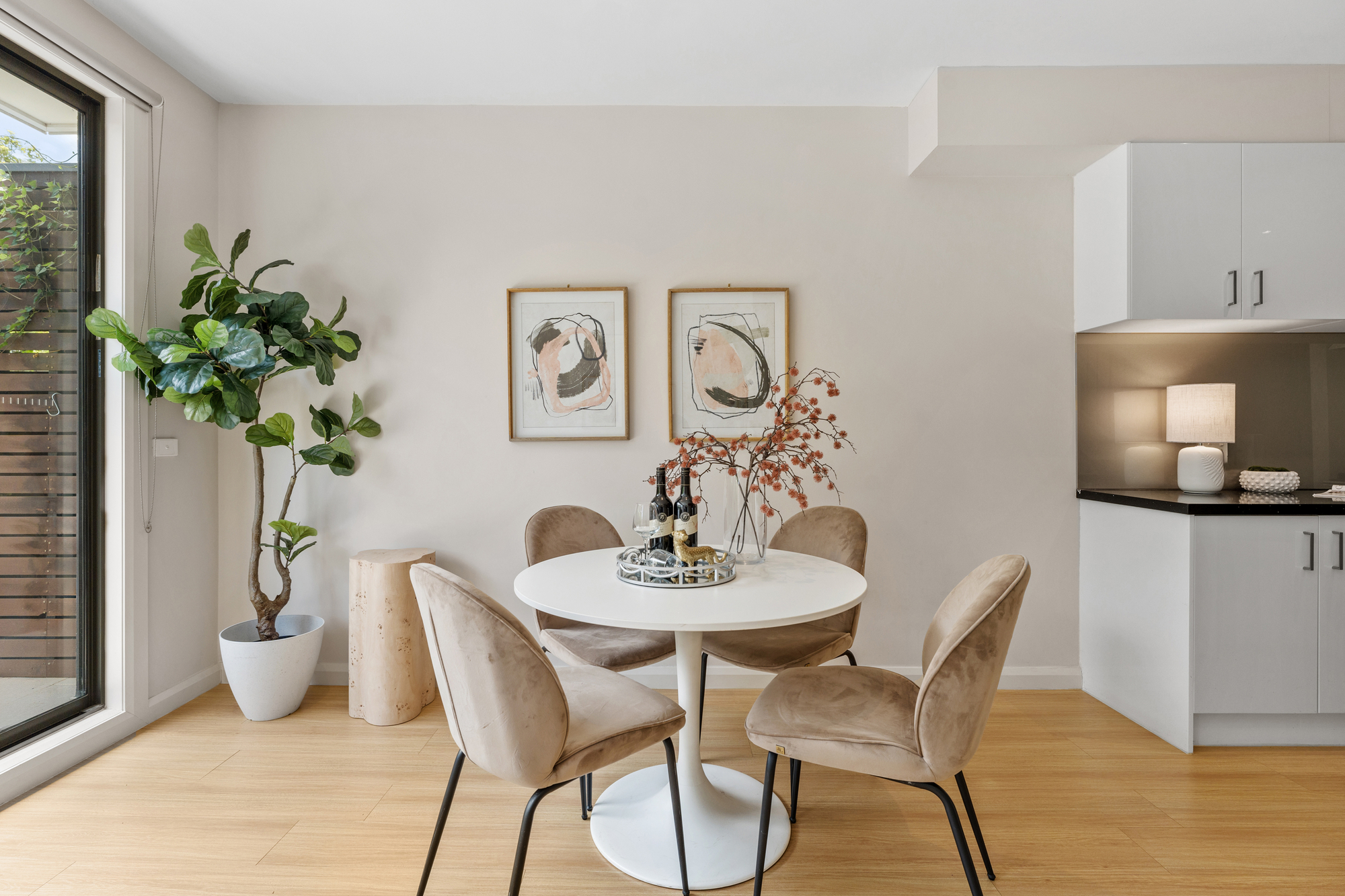 The main living and dining zone features timber flooring, split-system heating and cooling, and sliding doors opening directly to a private outdoor area, creating a seamless indoor–outdoor connection and allowing natural light to flow throughout the space.