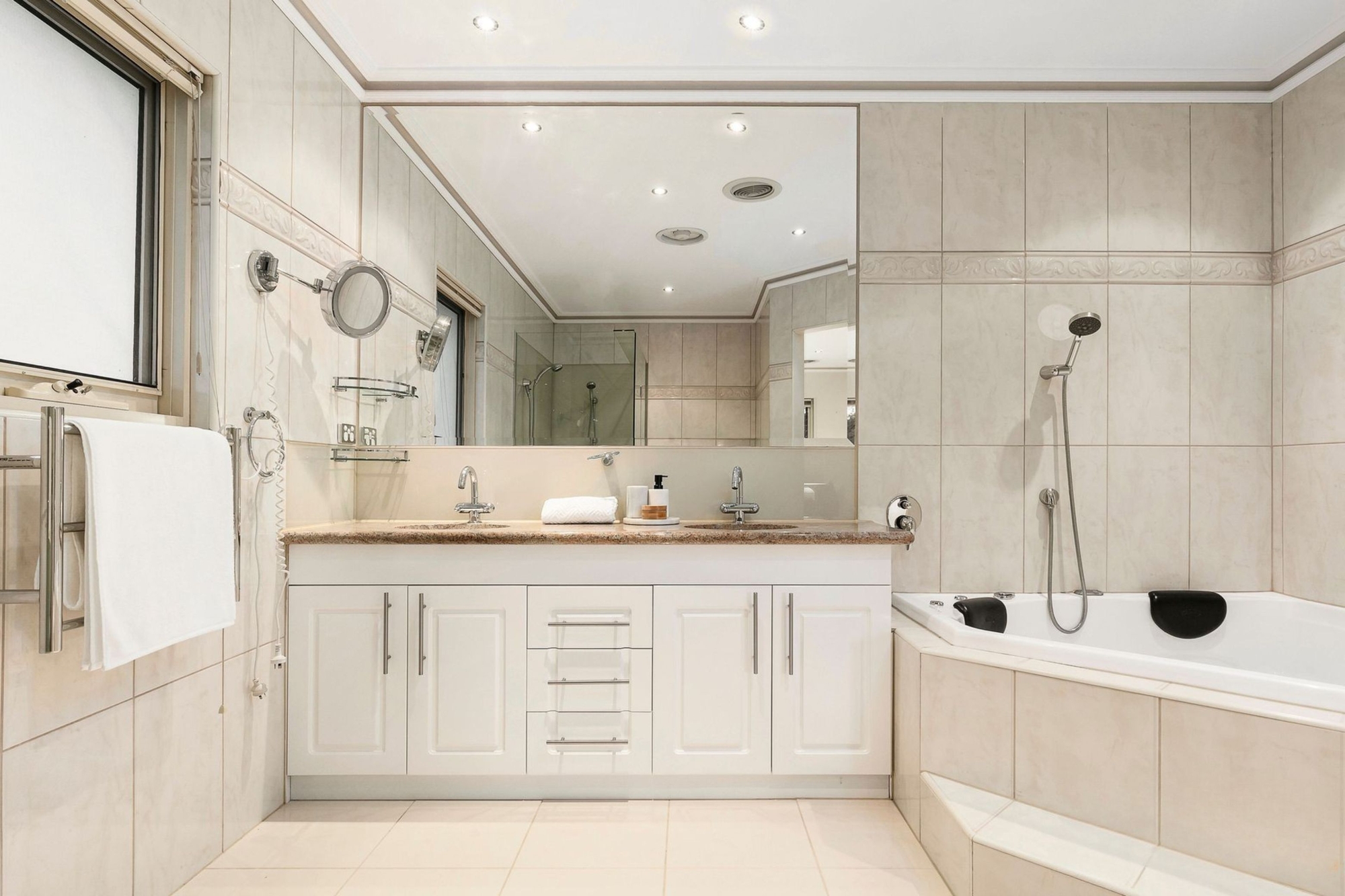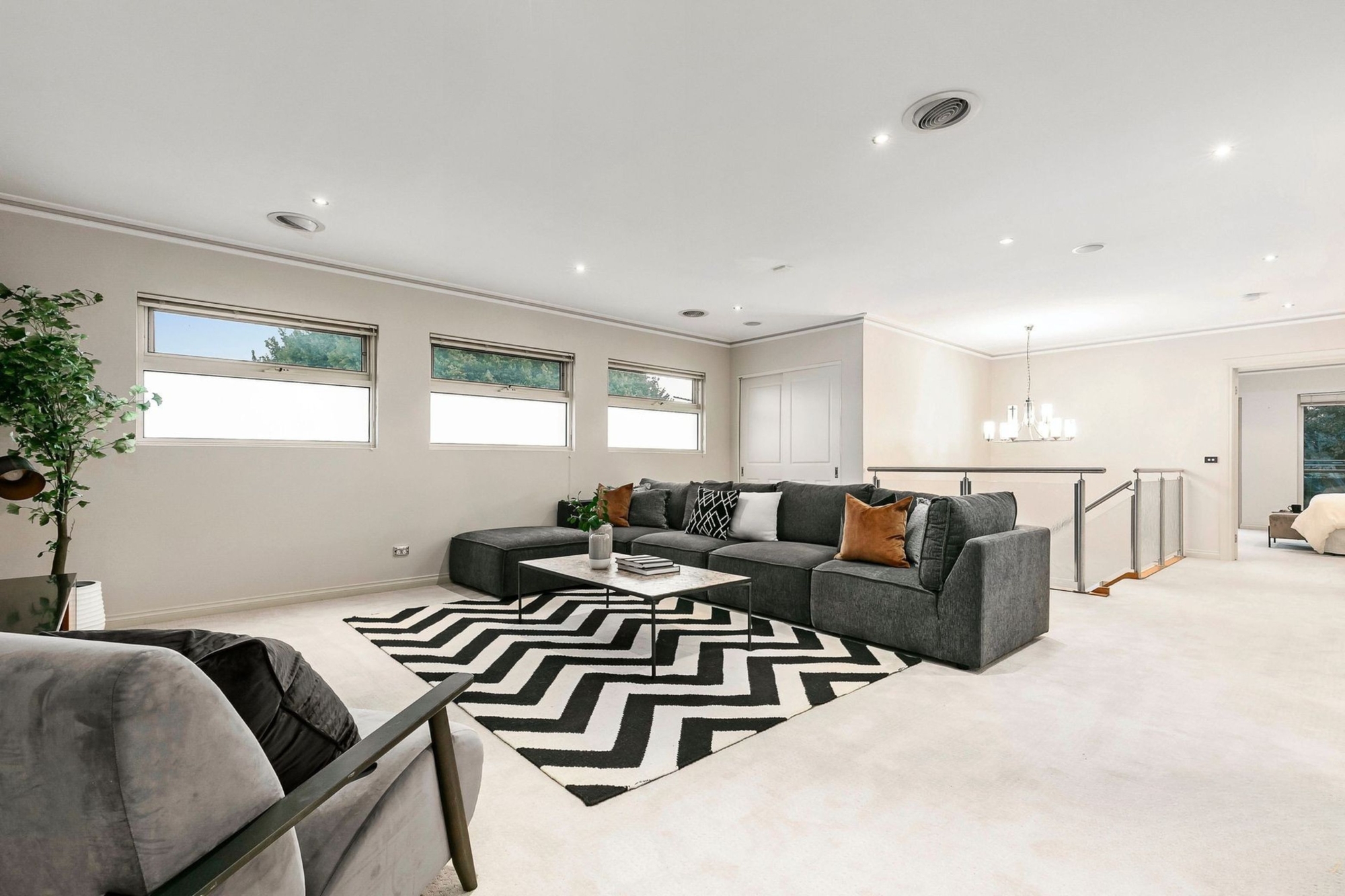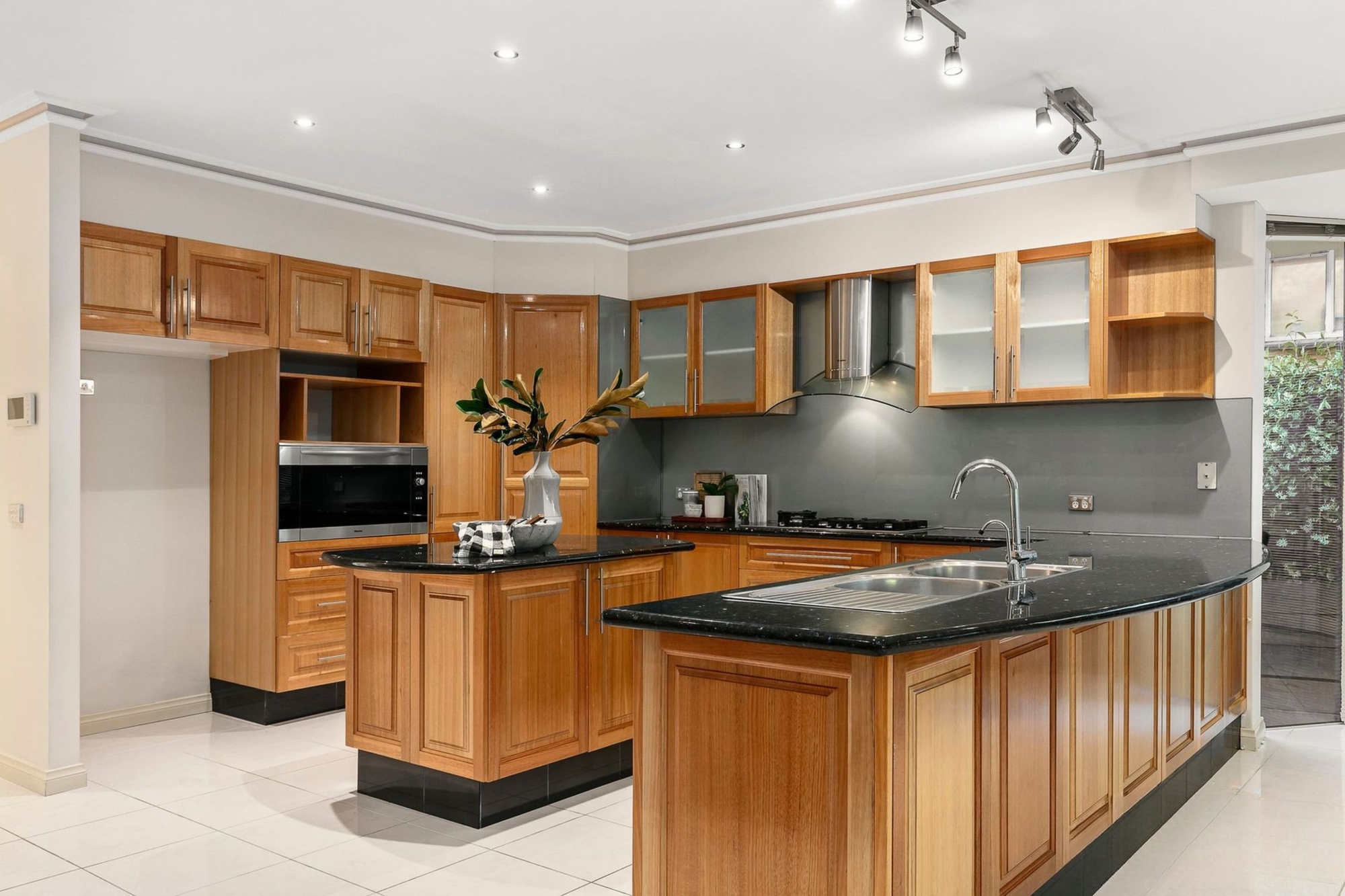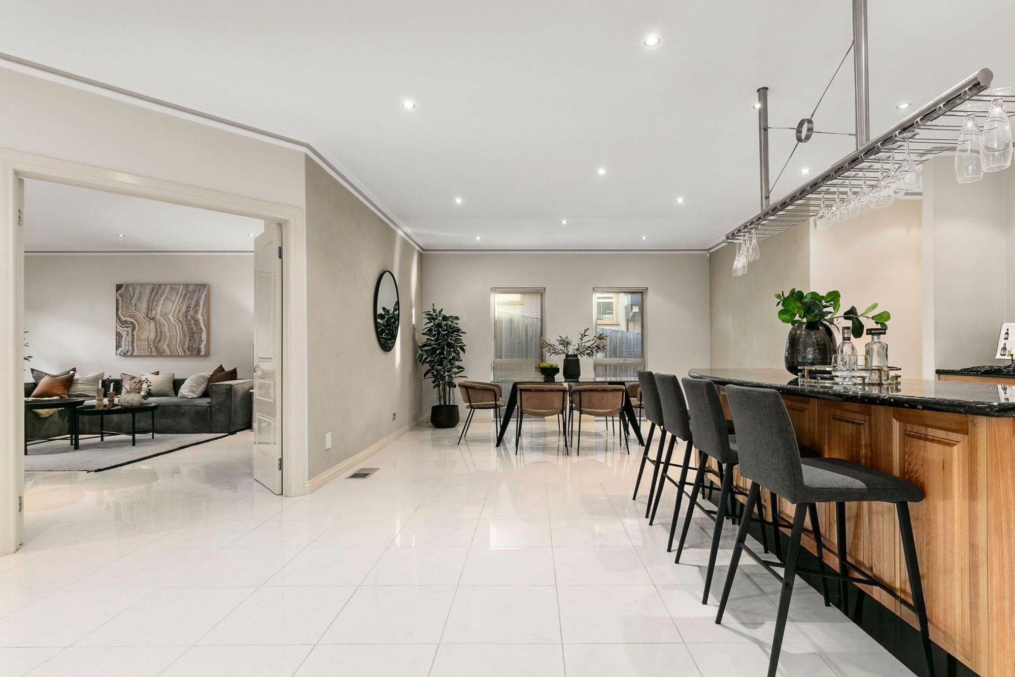 The ground floor dedicates itself to living, working, and entertaining, with its own office under spectacular raked ceilings. A choice of a living room, rumpus, casual and formal dining areas and a top floor entertaining space add to the layout’s freedom. When it’s time to celebrate milestones or kick back on the weekend, the Miele-appointed kitchen and adjoining bar serve up the perfect event hub. It’s absolutely made for entertaining with drink mixers, curved granite benches and lovely viewing across the living and dining areas.