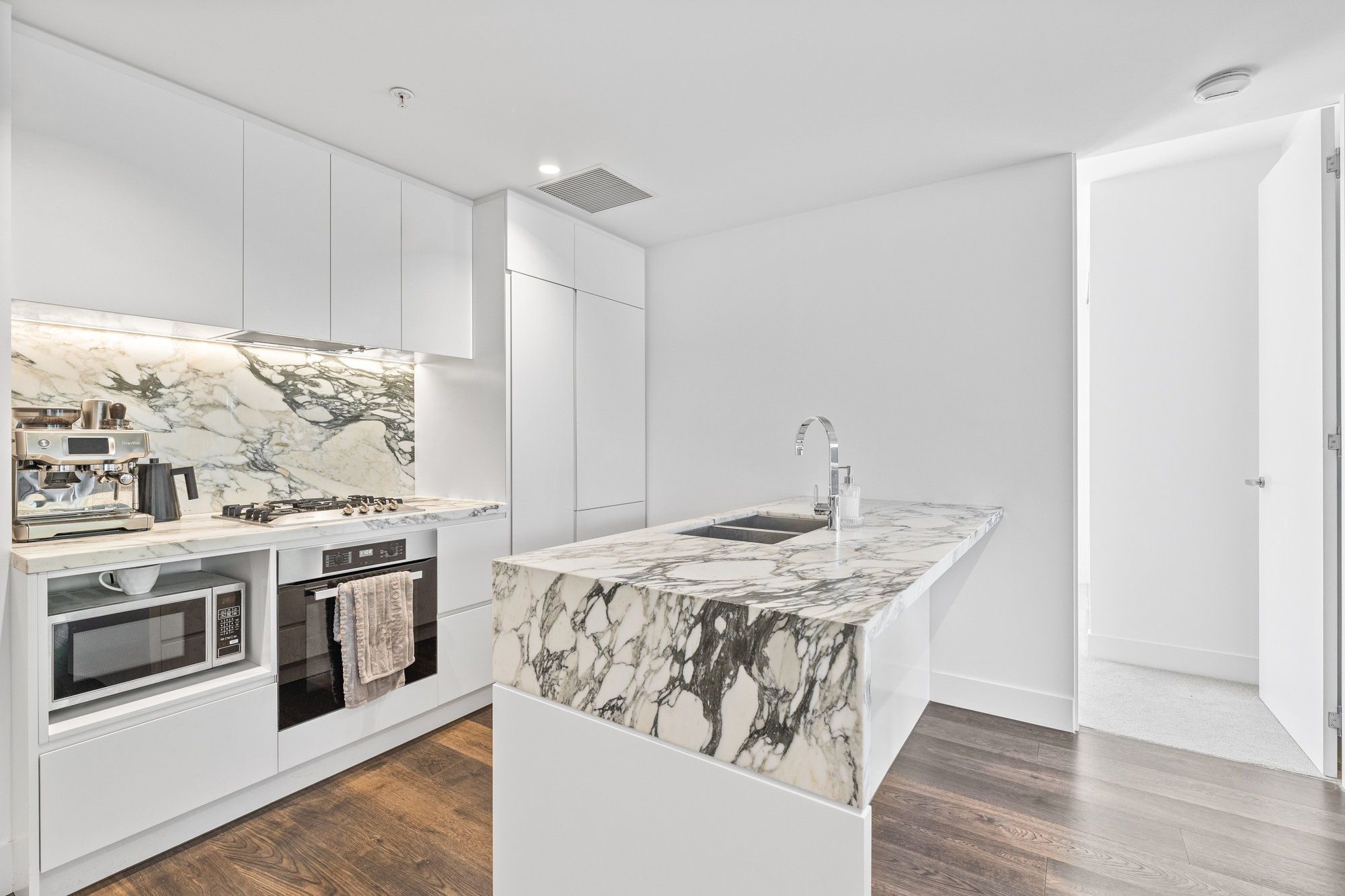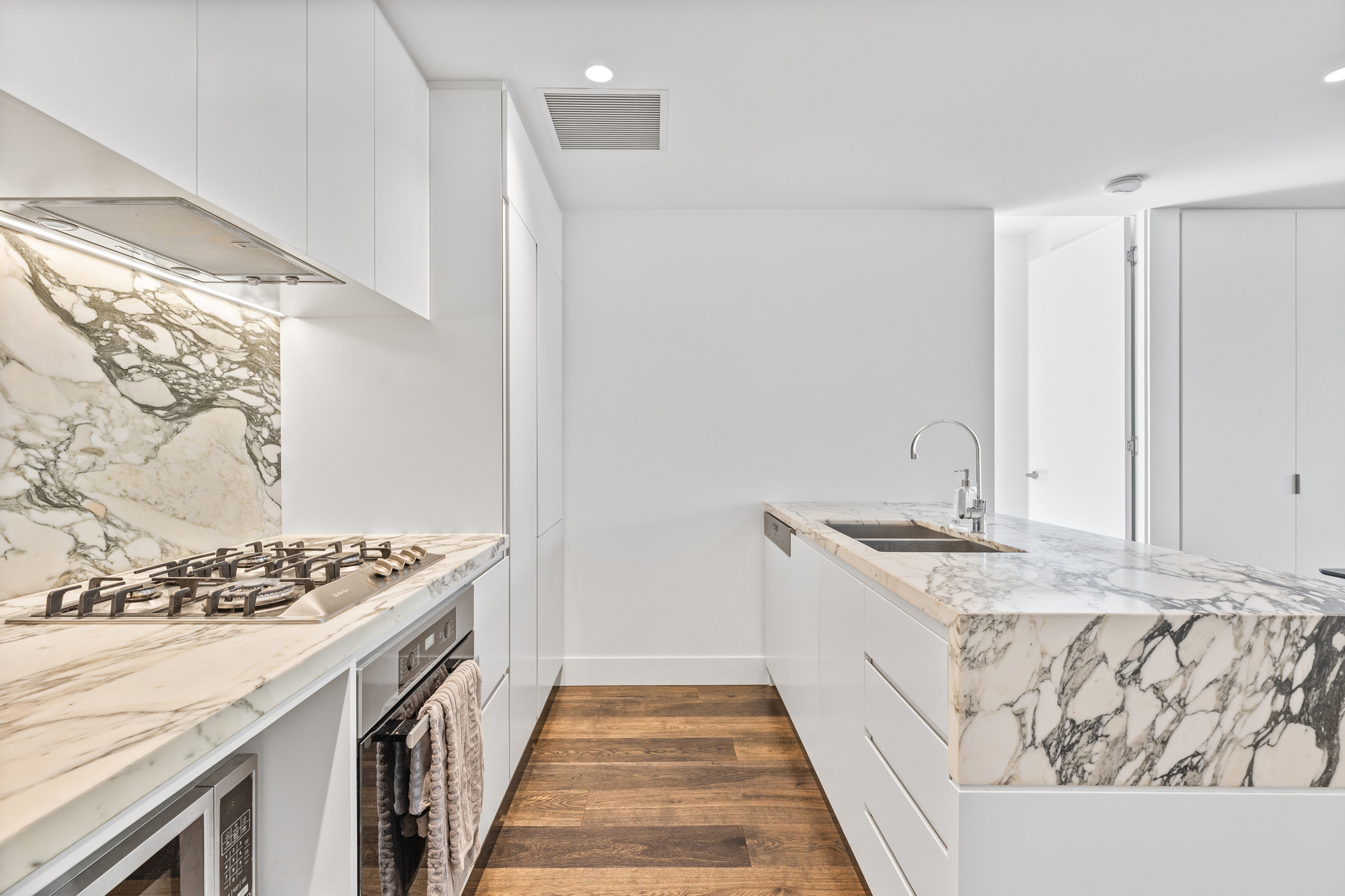 The open-plan living, dining, and kitchen area is filled with natural light from floor-to-ceiling windows, creating a bright and airy atmosphere. A large sliding door leads to a private outdoor patio that wraps around the apartment, offering a peaceful space to relax or entertain. The kitchen is equipped with high-end Miele appliances, including an oven, gas stove, and dishwasher, as well as marble benchtops, a double under-mount sink, and built-in fridge cabinetry for a sleek, seamless look.