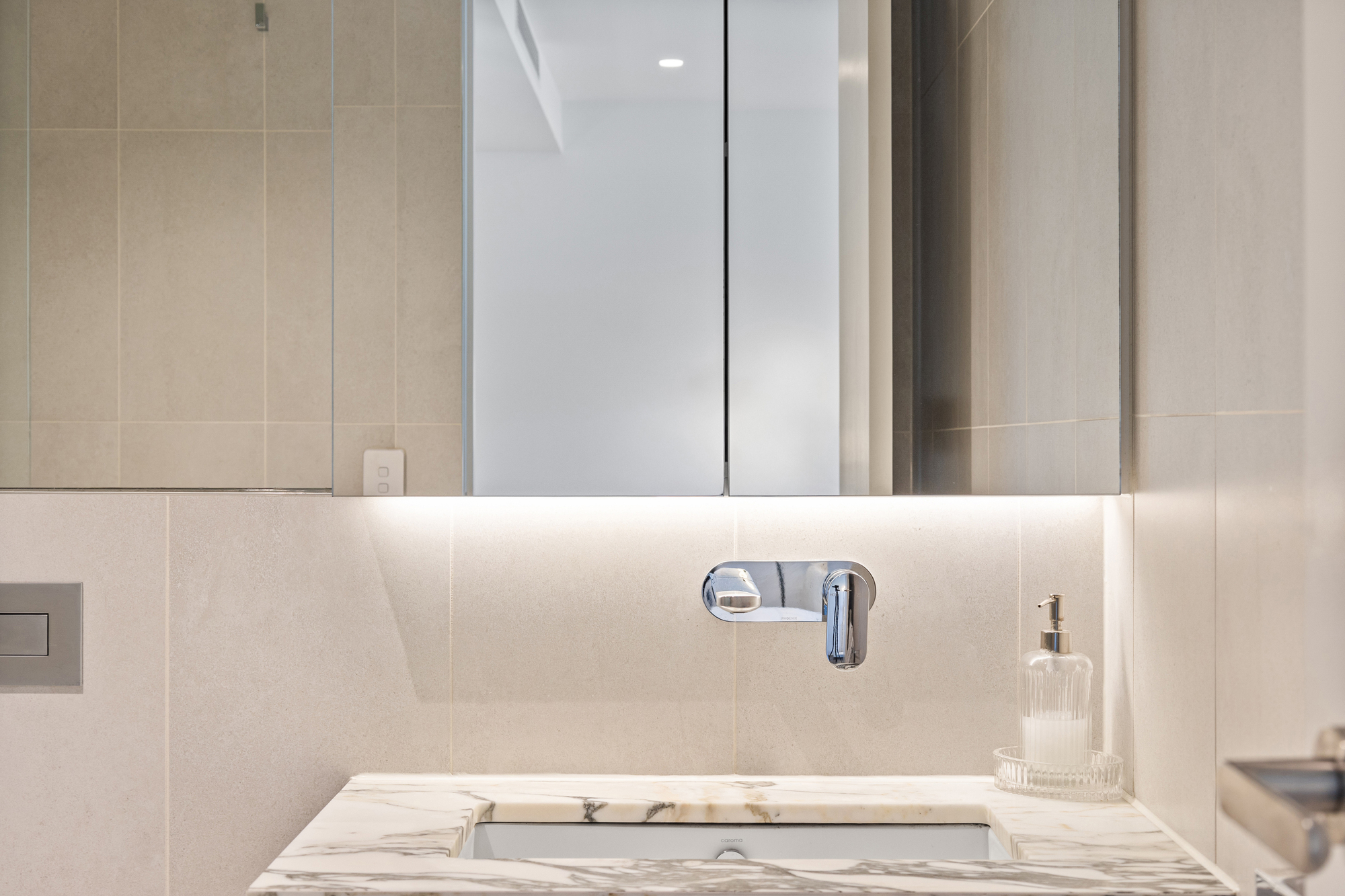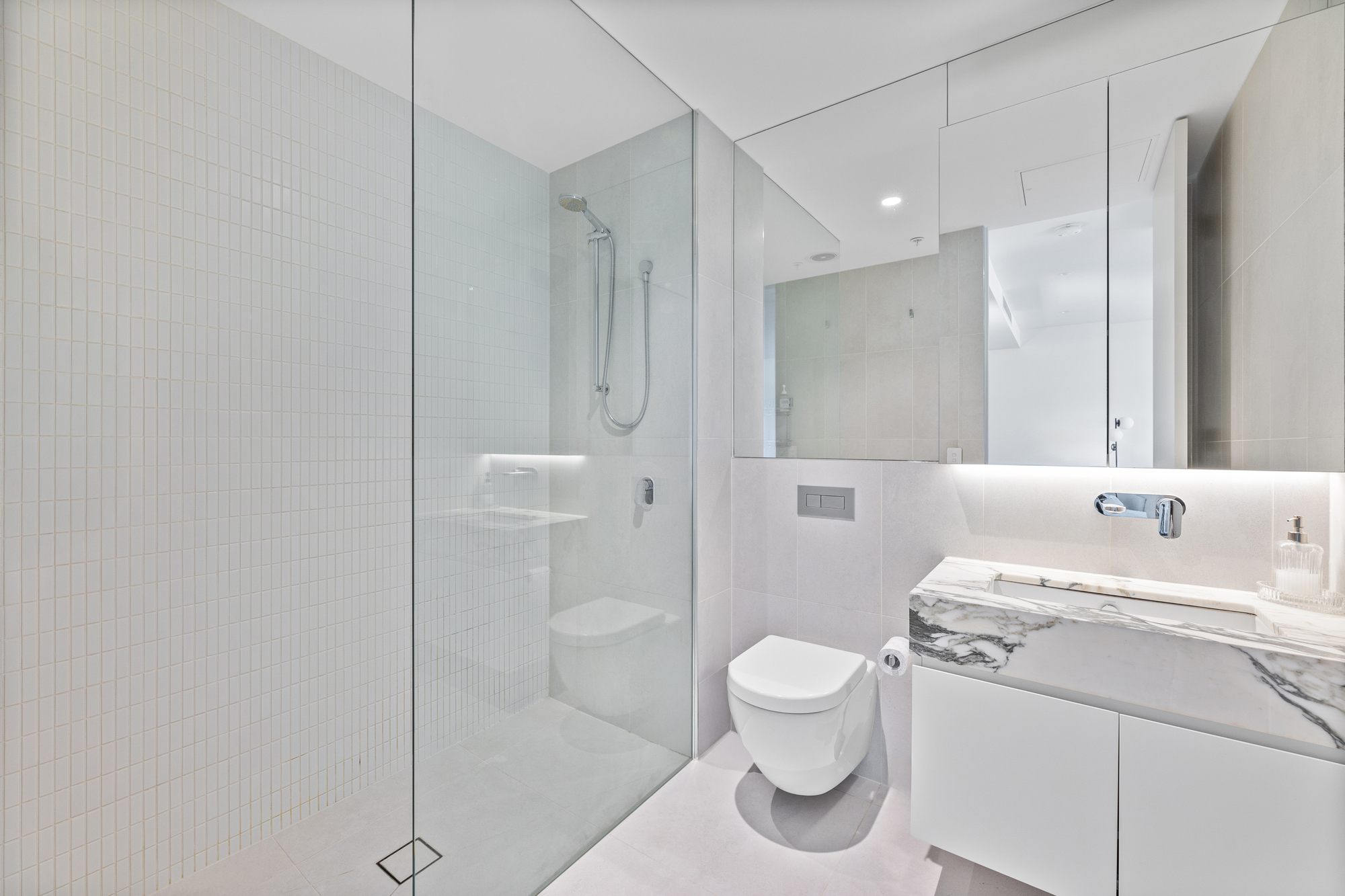 Both bedrooms feature built-in wardrobes, with the main bedroom boasting direct access to the outdoor area. The bathroom is elegantly tiled floor to ceiling with a frameless shower, completing this stylish apartment.